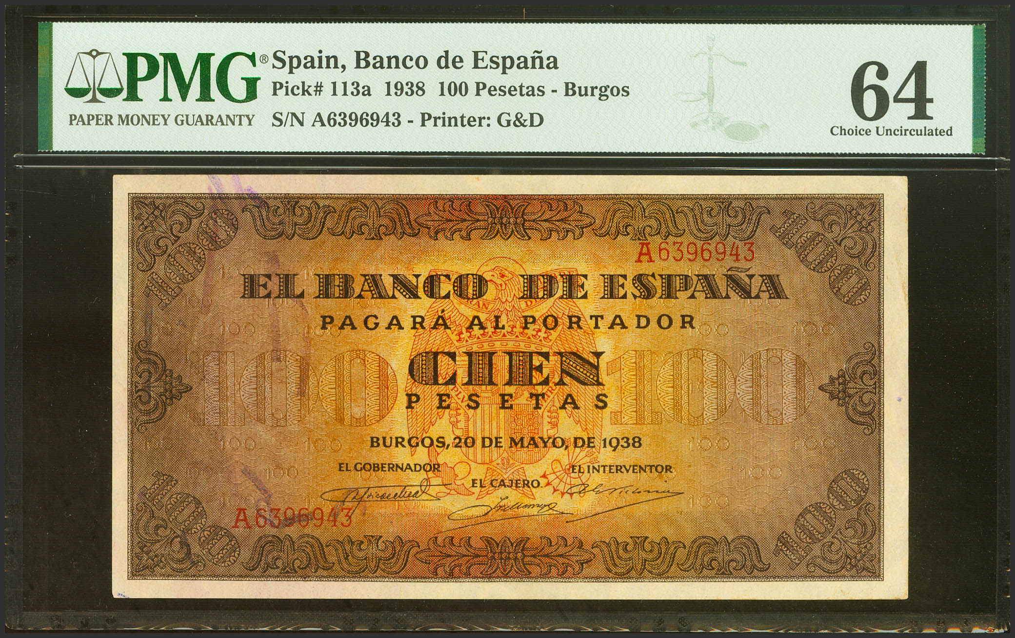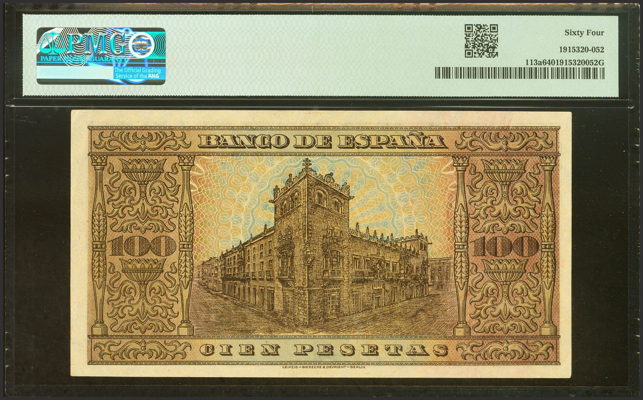 100 Pesetas. May 20, 1938. Series A. (Edifil 2023: 432, Pick: 113a). Unusual in this condition. Uncirculated. PMG64 encapsulated.