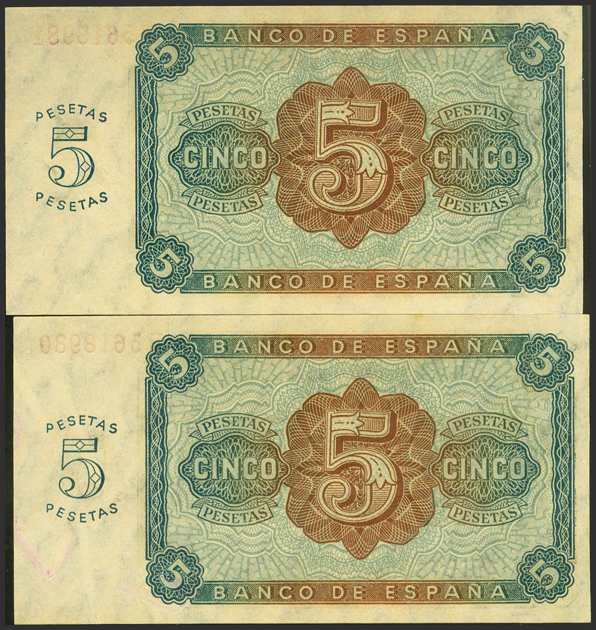 5 Pesetas. August 10, 1938. Consecutive pair. Series B. (Edifil 2021: 435a). Retains all its original finish. Uncirculated.