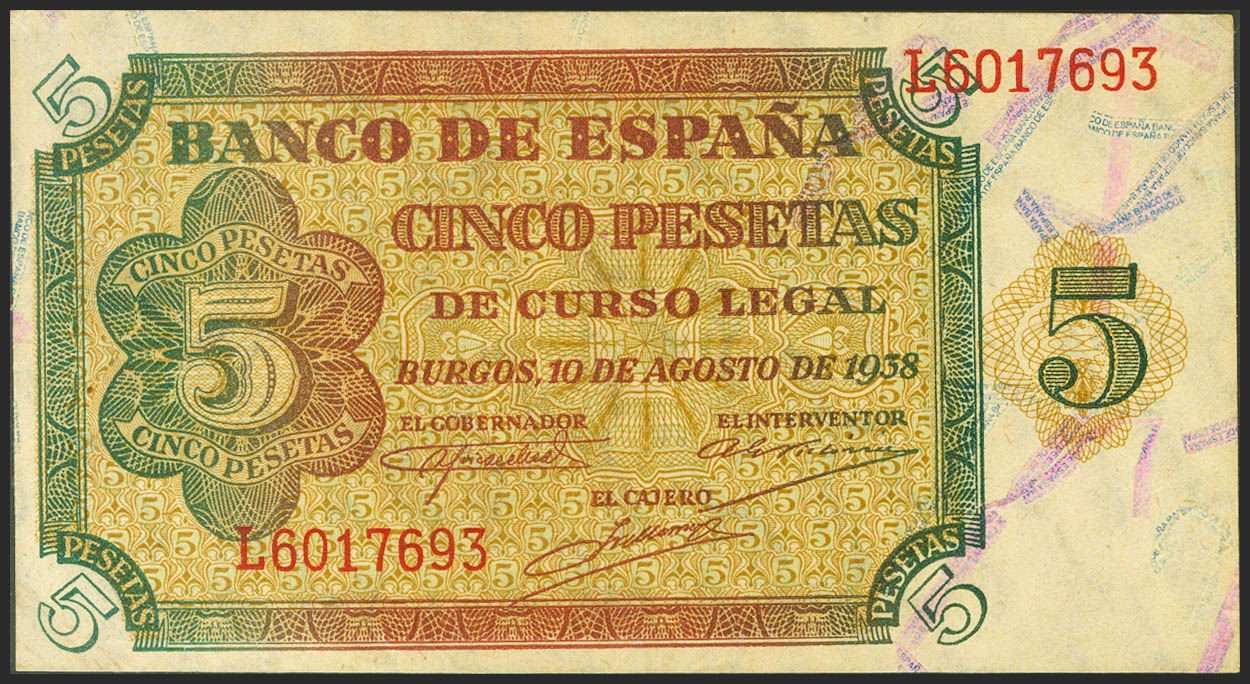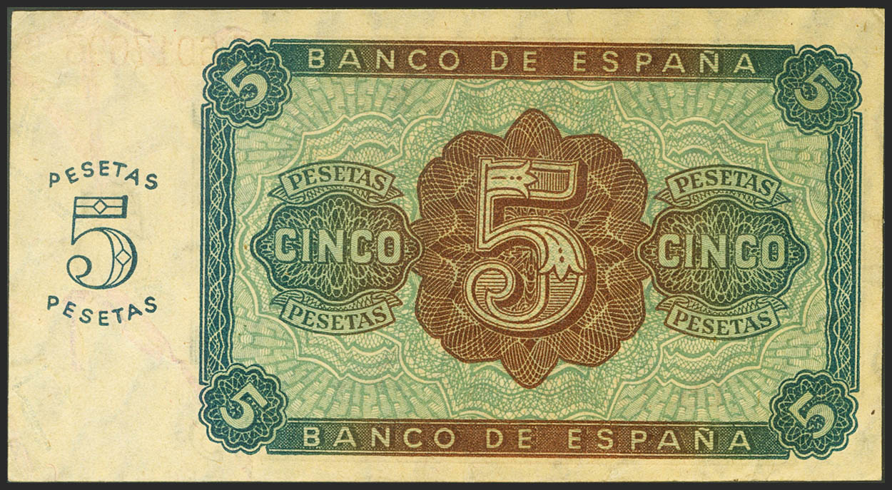 English 5 Pesetas. August 10, 1938. Series L. (Edifil 2021: 435a). Original finish. Uncirculated.