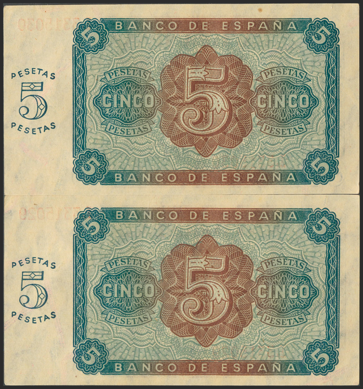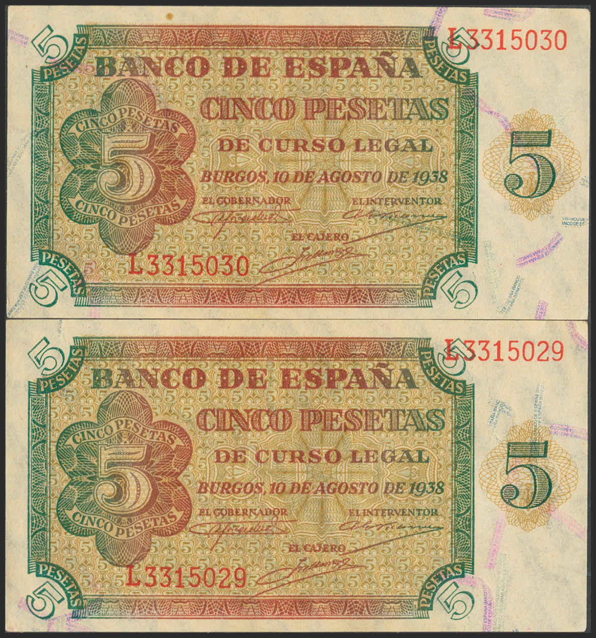 5 Pesetas. August 10, 1938. Consecutive pair. Series L. (Edifil 2017: 435a). Uncirculated-.