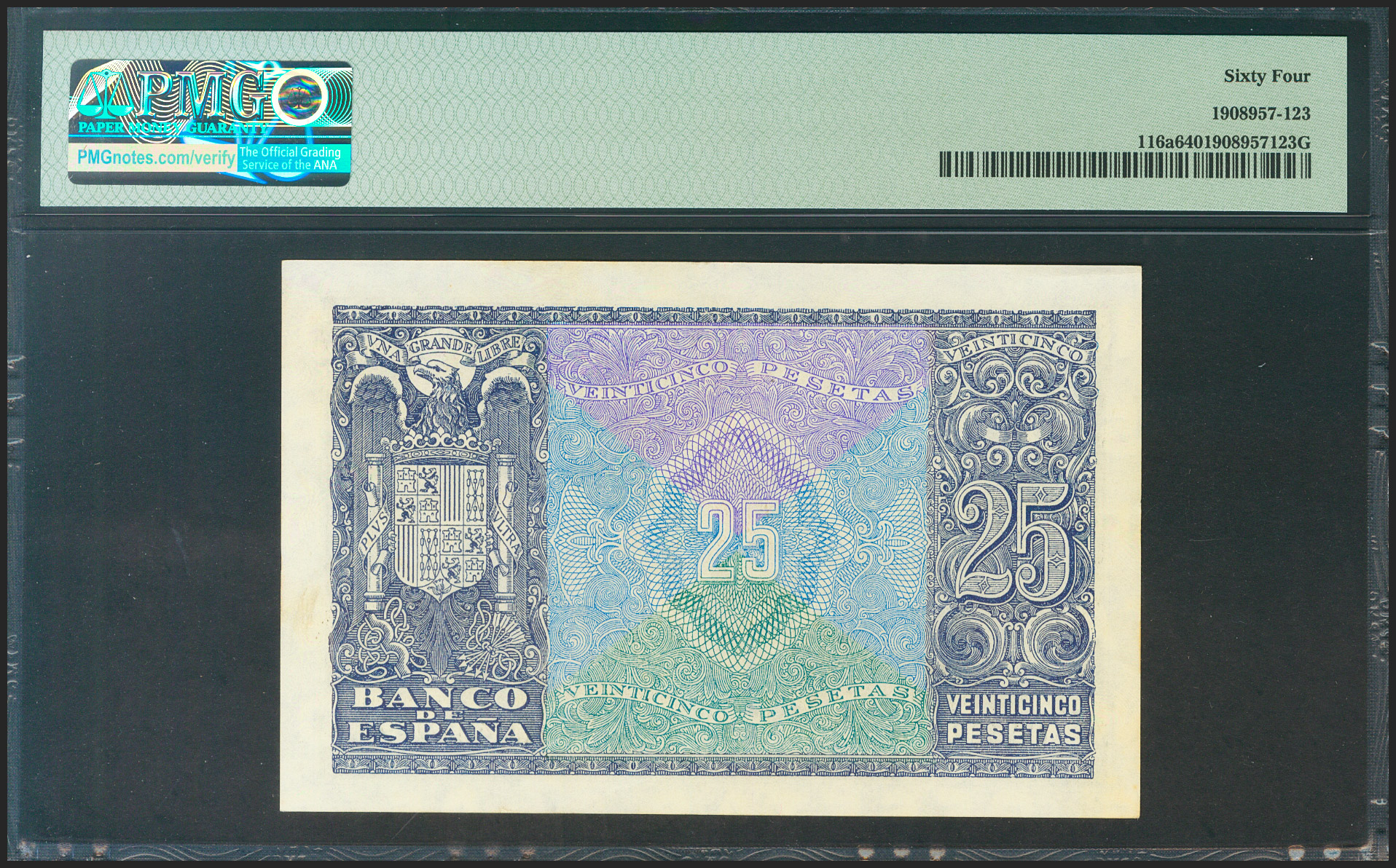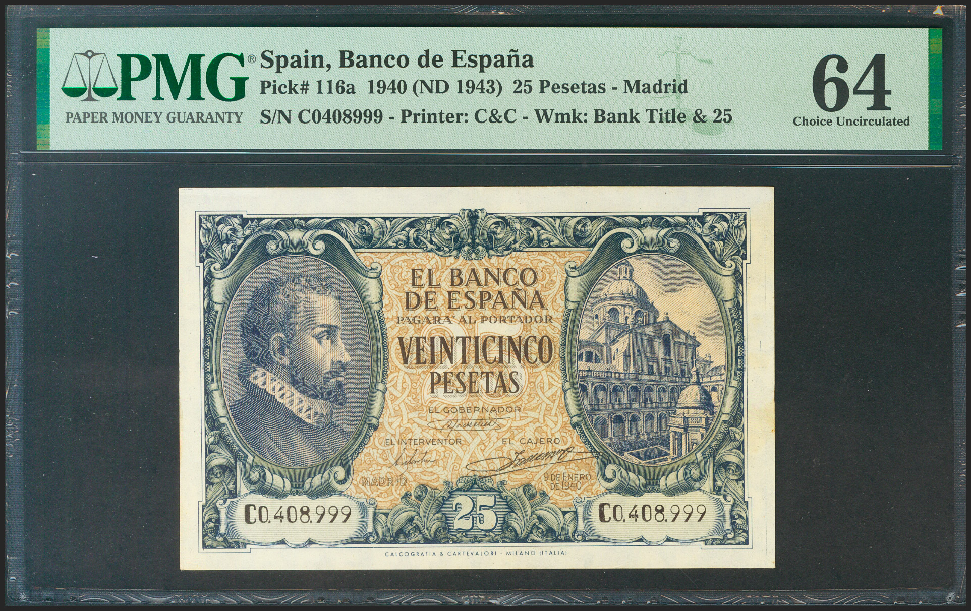 English 25 Pesetas. January 9, 1940. Series C. (Edifil 2021: 436a, Pick: 116a). Rare in this condition. Uncirculated. PMG64 encapsulated.
