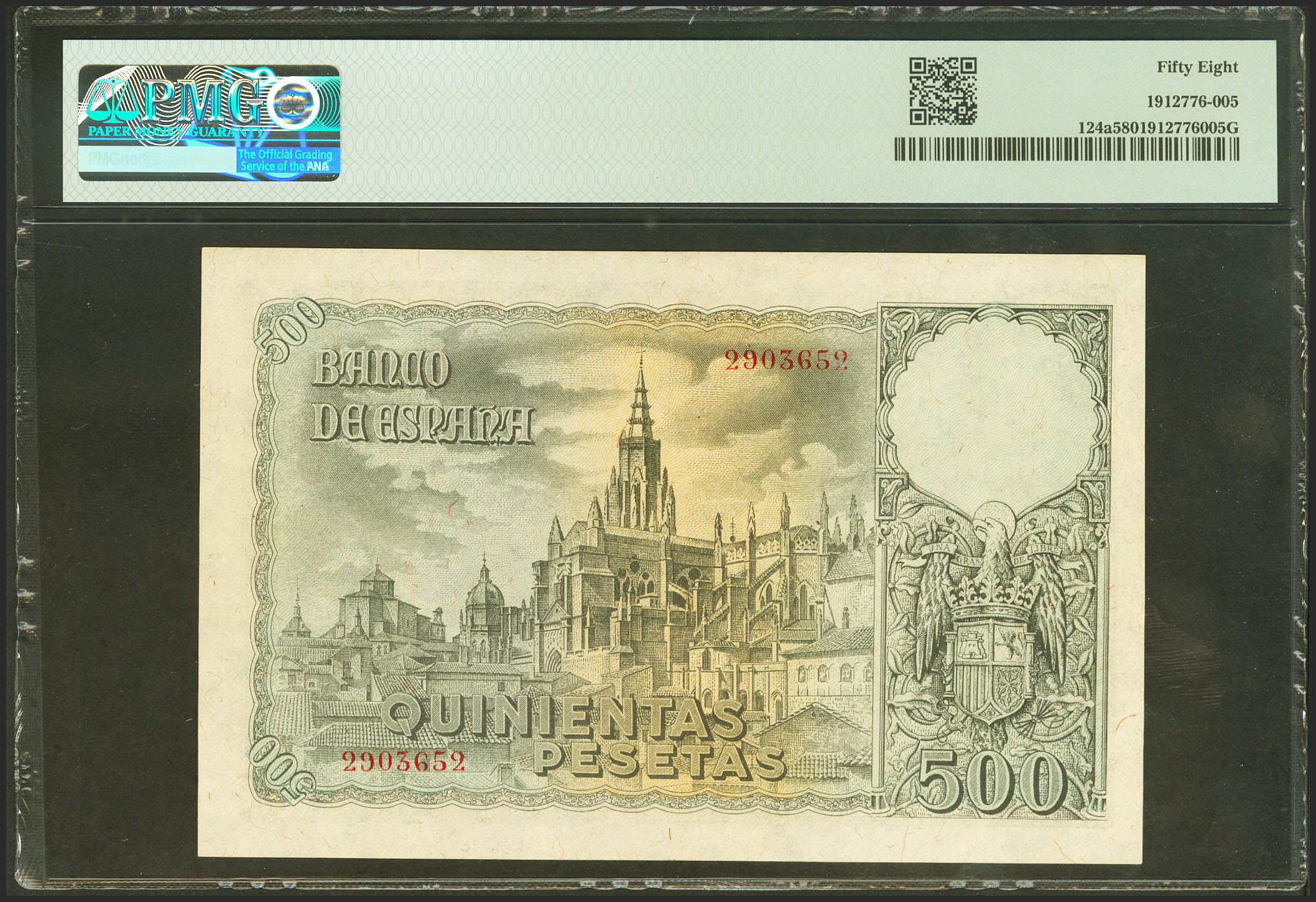 500 Pesetas. October 21, 1940. No serial number. (Edifil 2021: 444, Pick: 124a). Unusual in this exceptional condition. EF++. PMG58 package.