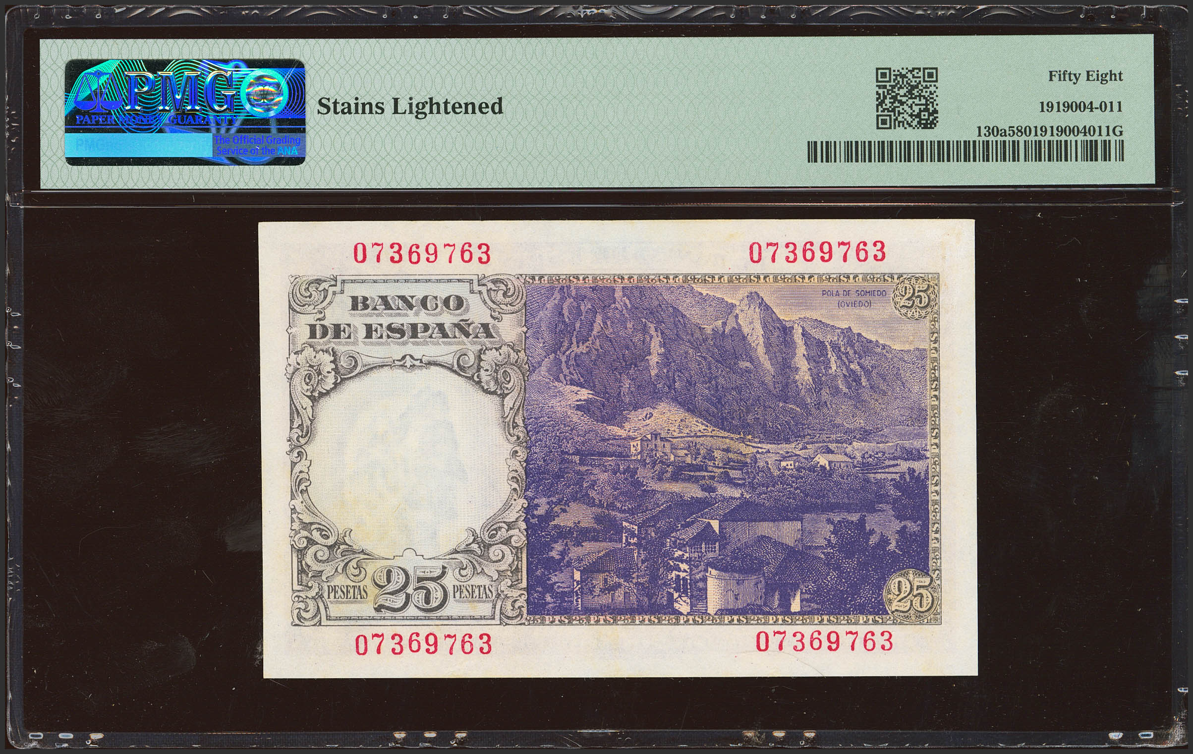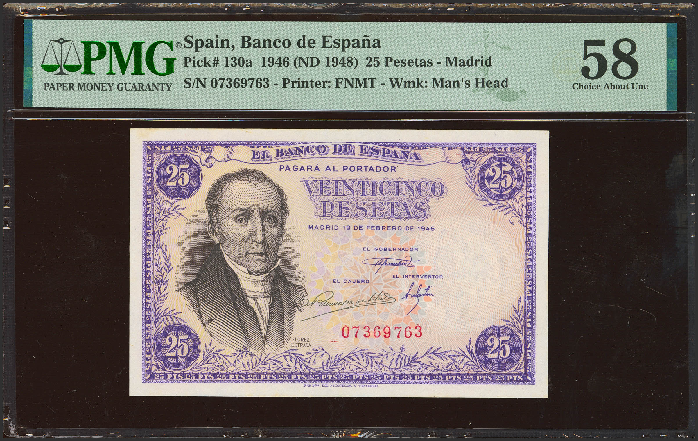 25 Pesetas. February 19, 1946. No serial number. (Edifil 2023: 450, Pick: 130a). Good Extremely Fine+. PMG58 package.