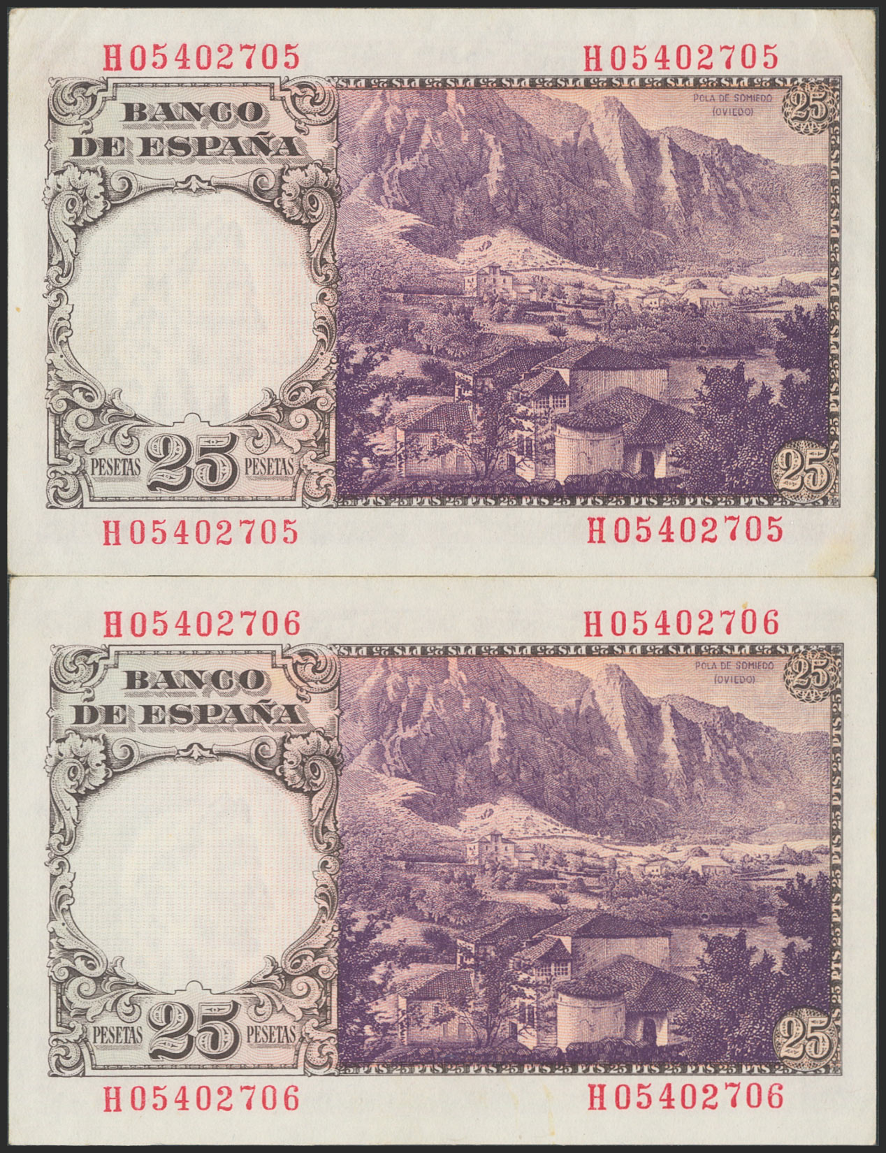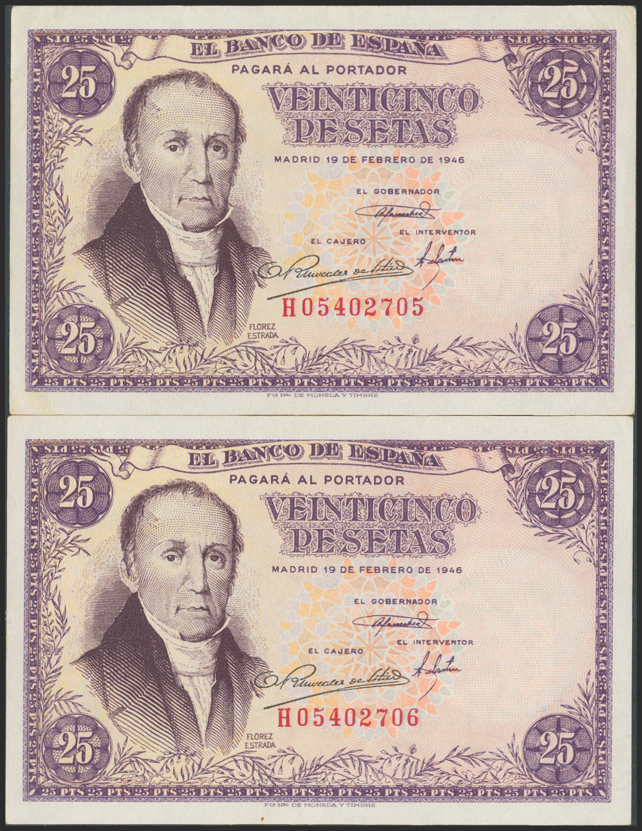 25 Pesetas. February 19, 1946. Consecutive pair. Series H. (Edifil 2017: 450a). Original condition. EF+.