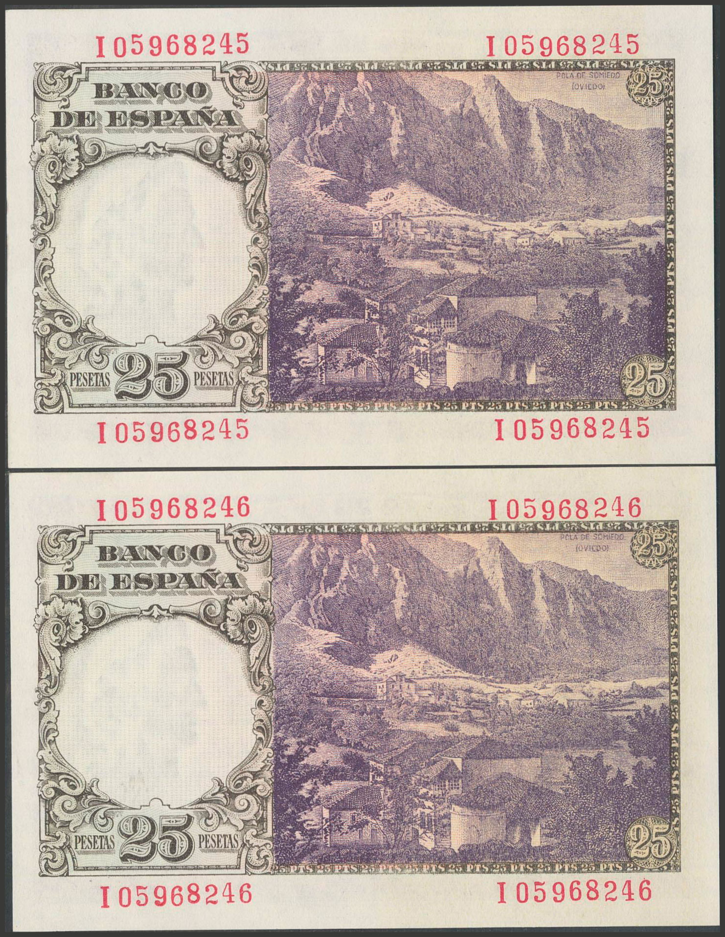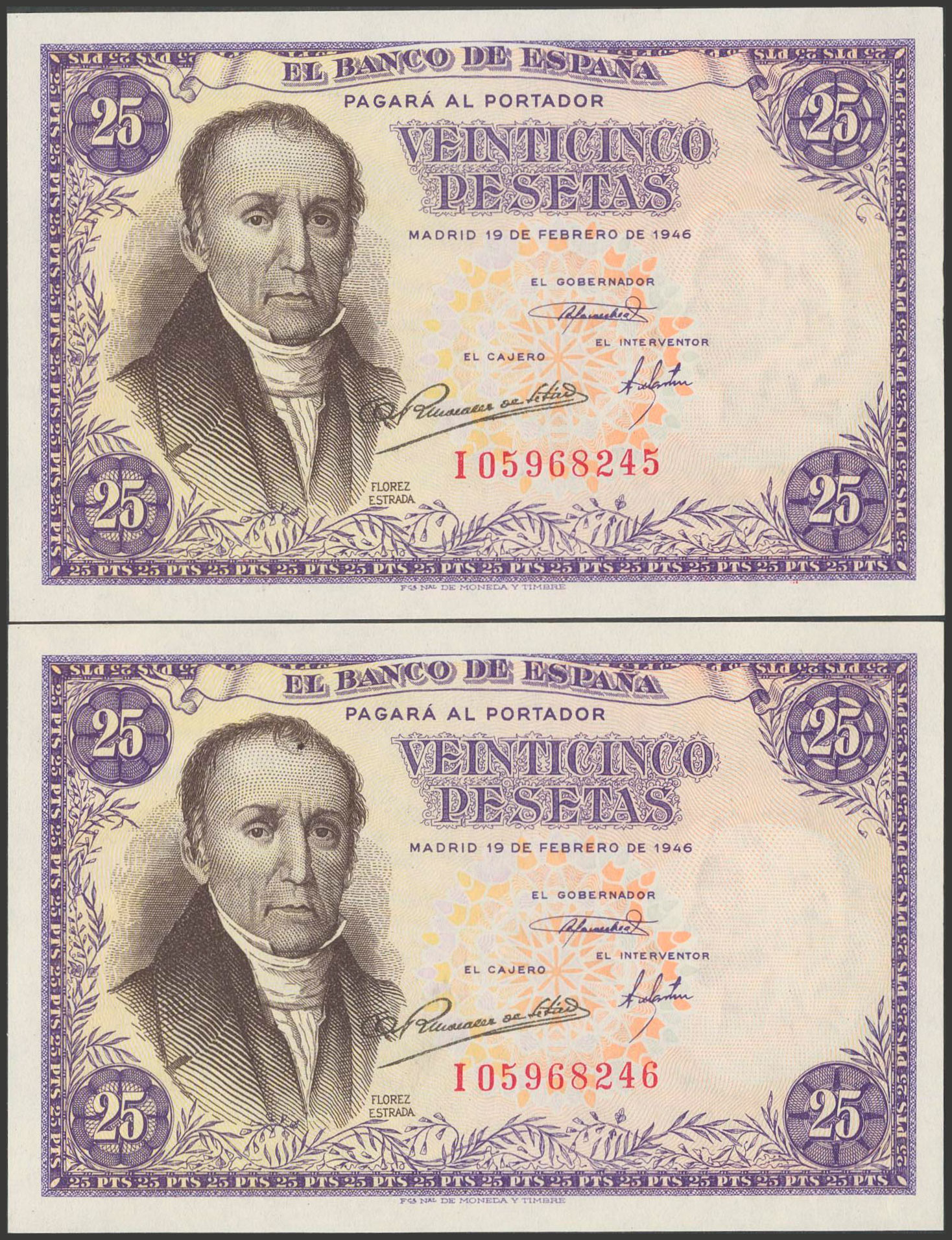 25 Pesetas. February 19, 1946. Consecutive pair. Series I. (Edifil 2017: 450a). Original finish. Uncirculated-.