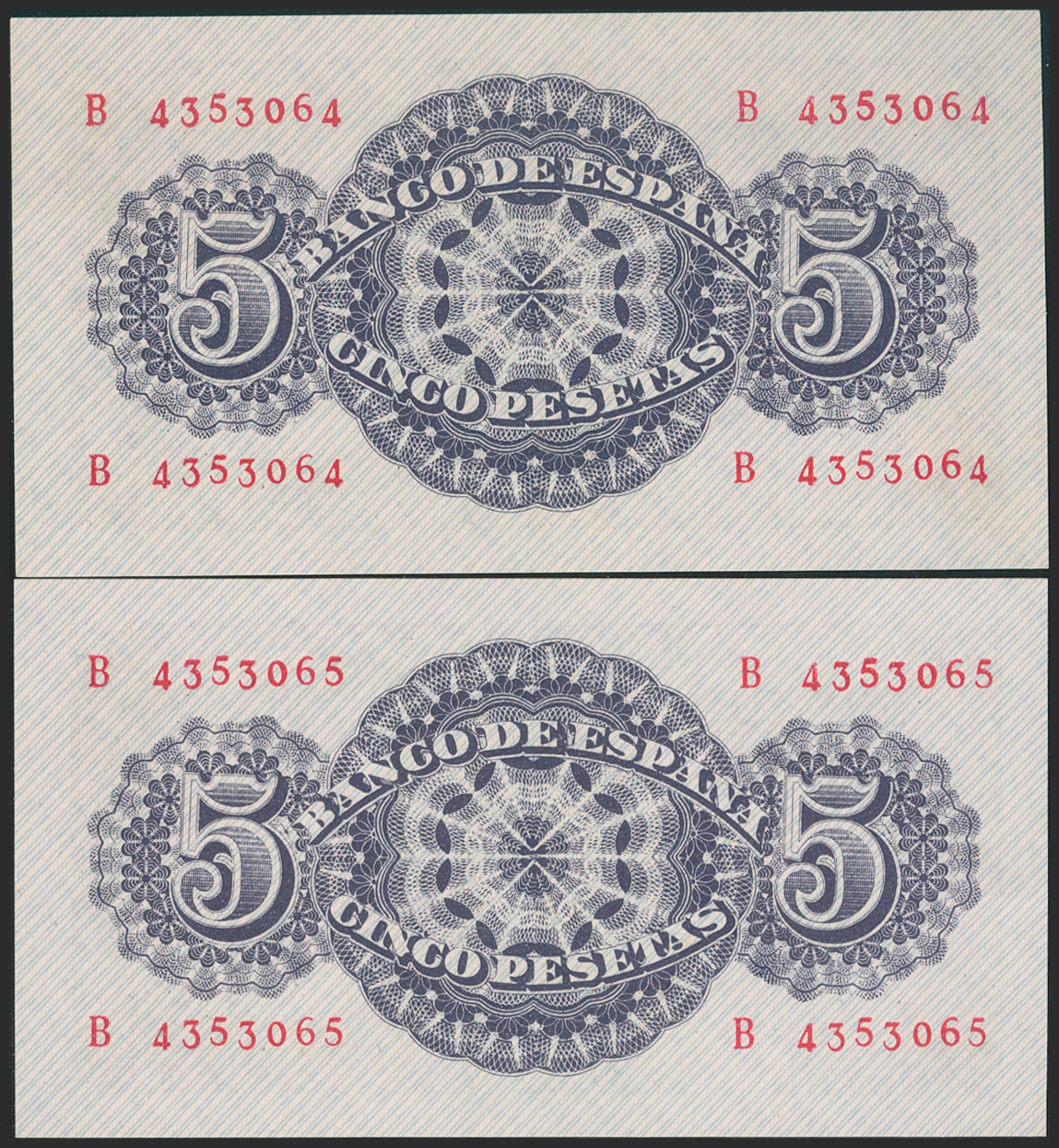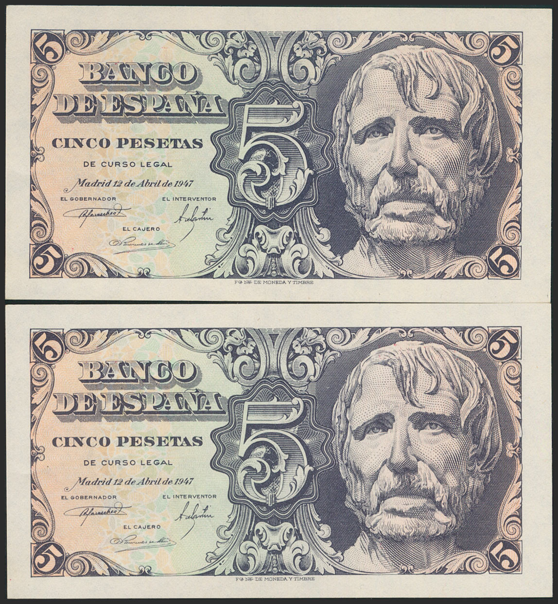 English 5 Pesetas. April 12, 1947. Consecutive pair. Series B. (Edifil 2021: 454a). Original finish. Uncirculated-.