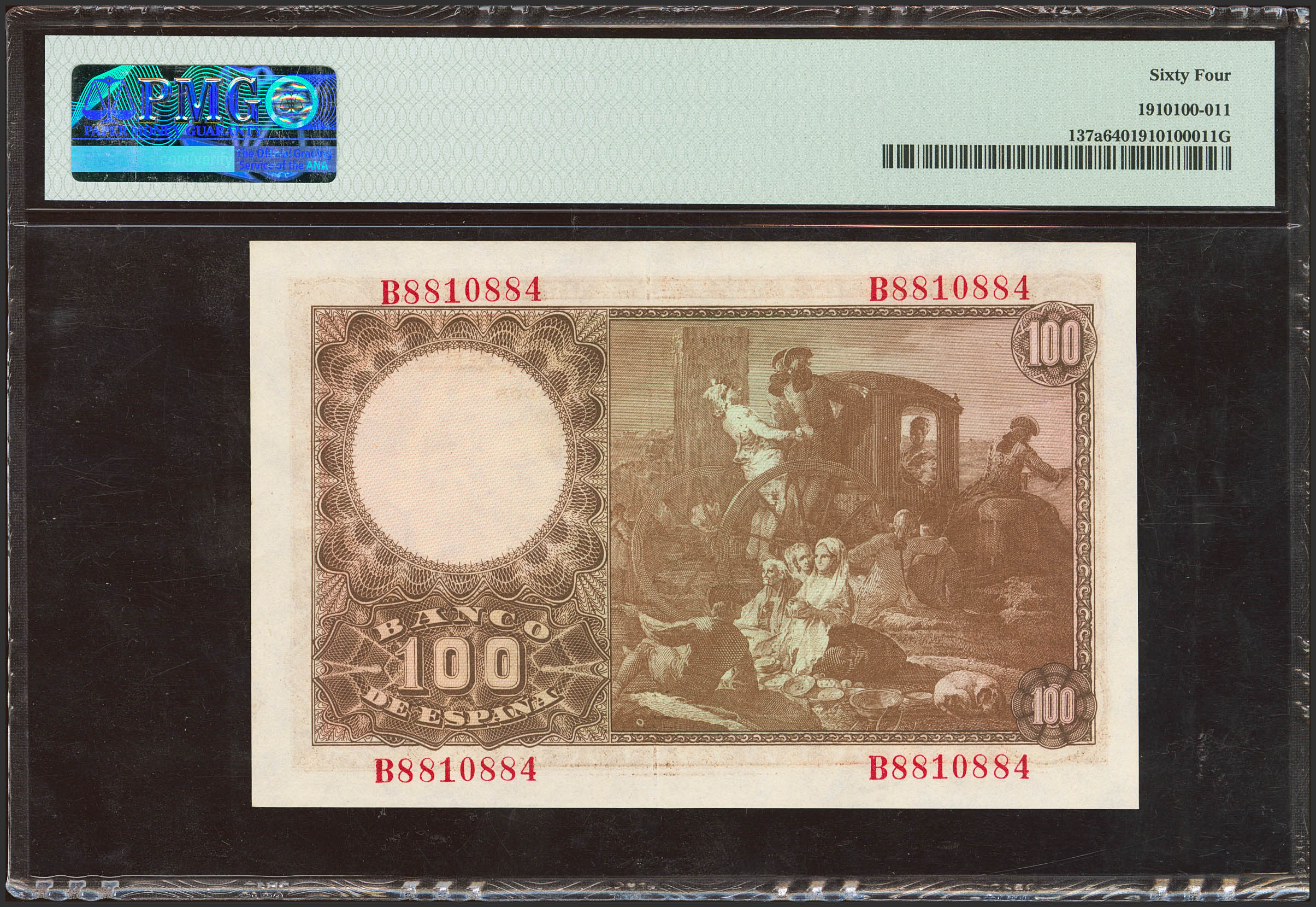English 100 Pesetas. May 2, 1948. Series B. (Edifil 2023: 456a, Pick: 137a). Uncirculated. PMG64 encapsulated.