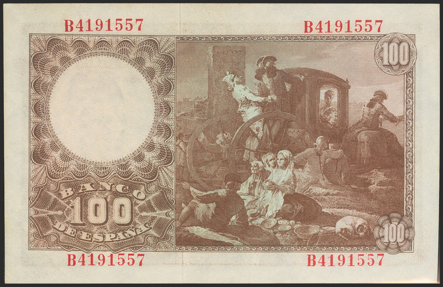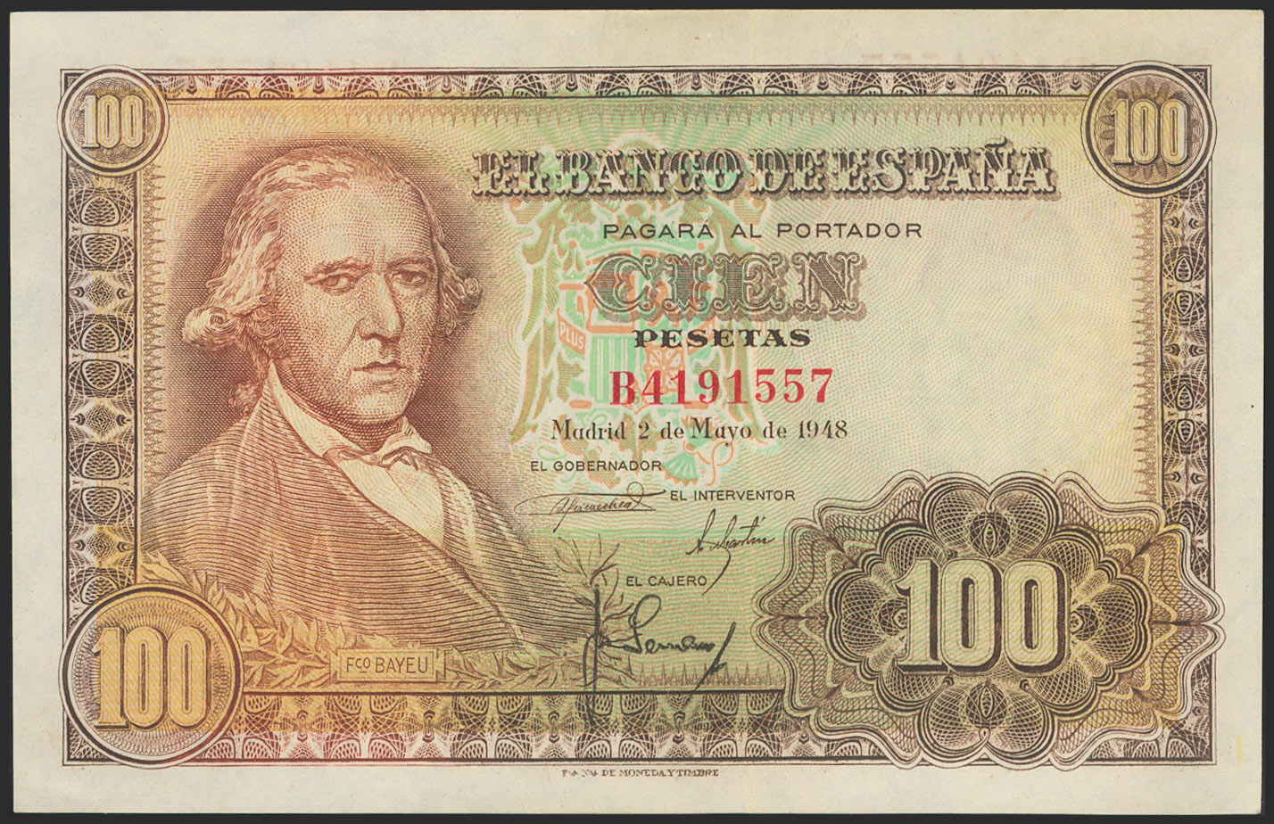 English 100 Pesetas. May 2, 1948. Series B. (Edifil 2021: 456a). Original finish. Uncirculated--.