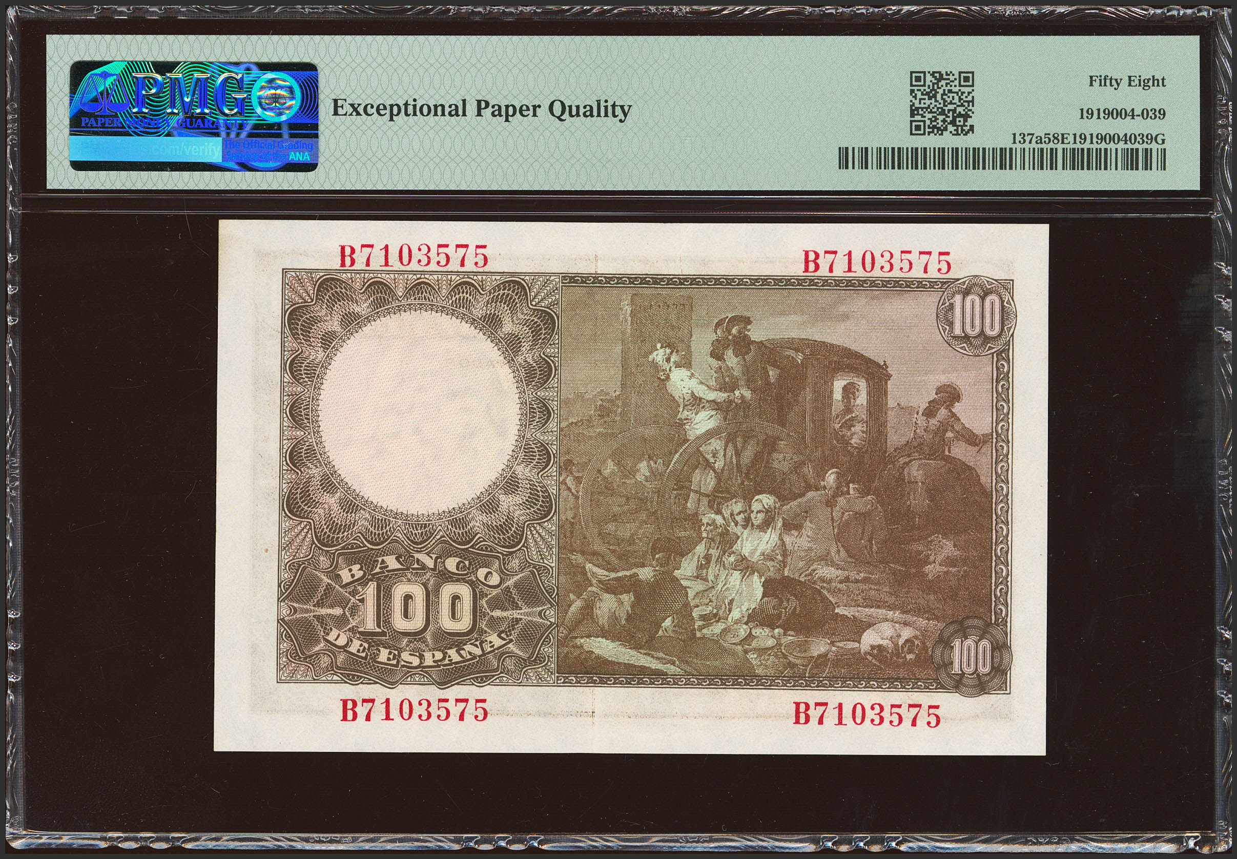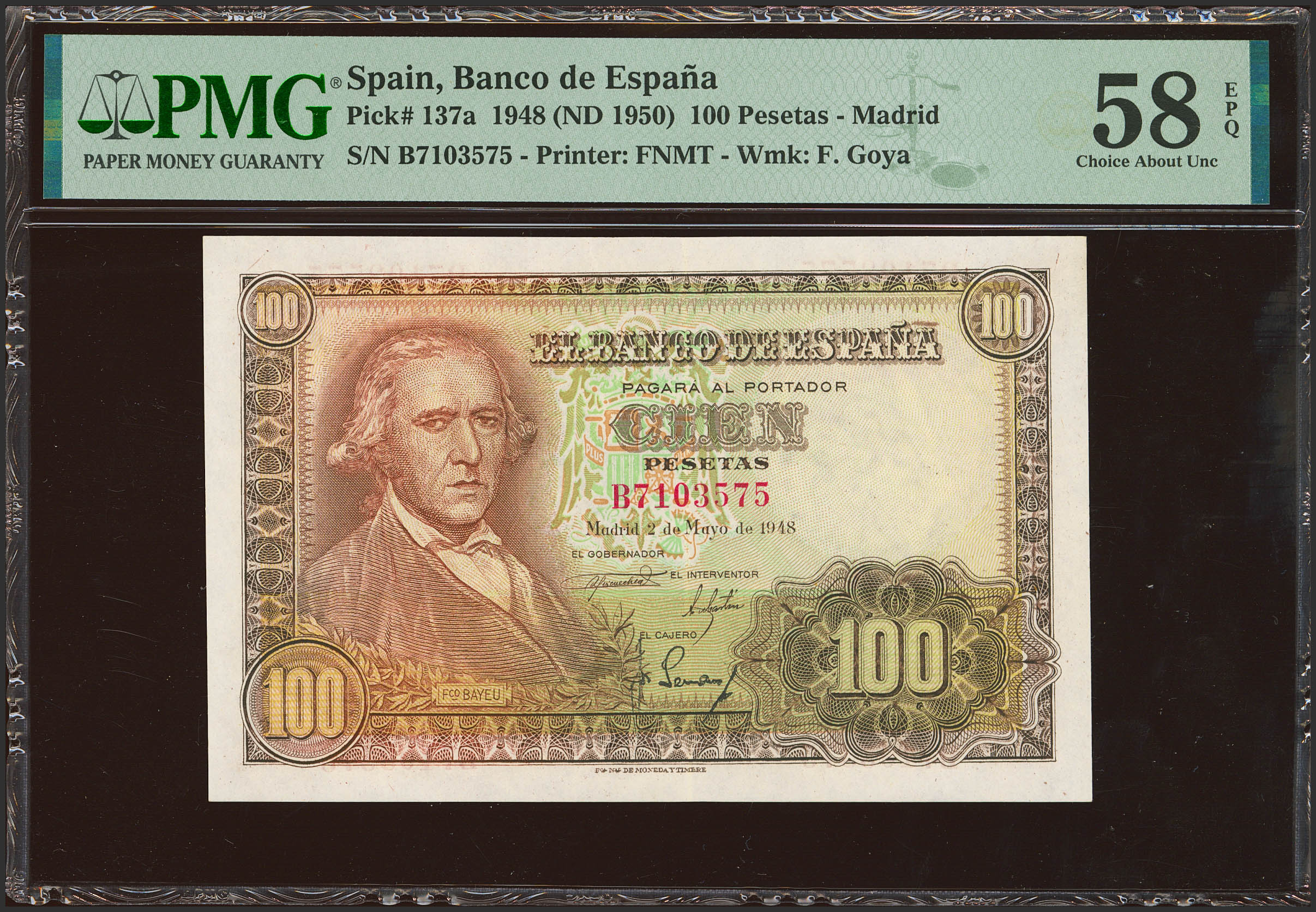 English 100 Pesetas. May 2, 1948. Series B. (Edifil 2023: 456a, Pick: 137a). Good Extremely Fine++. PMG58EPQ package.