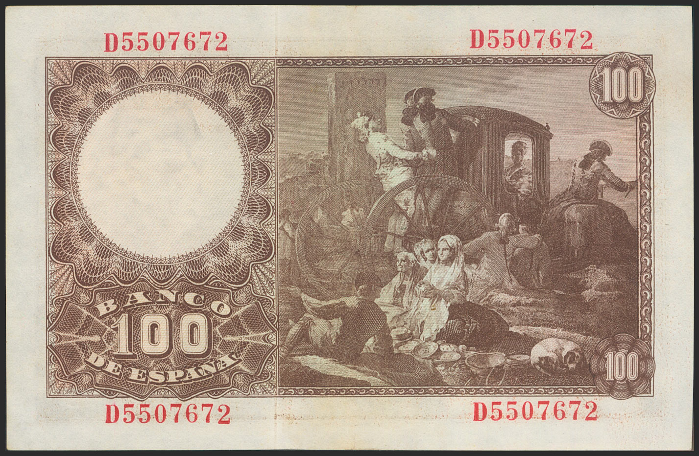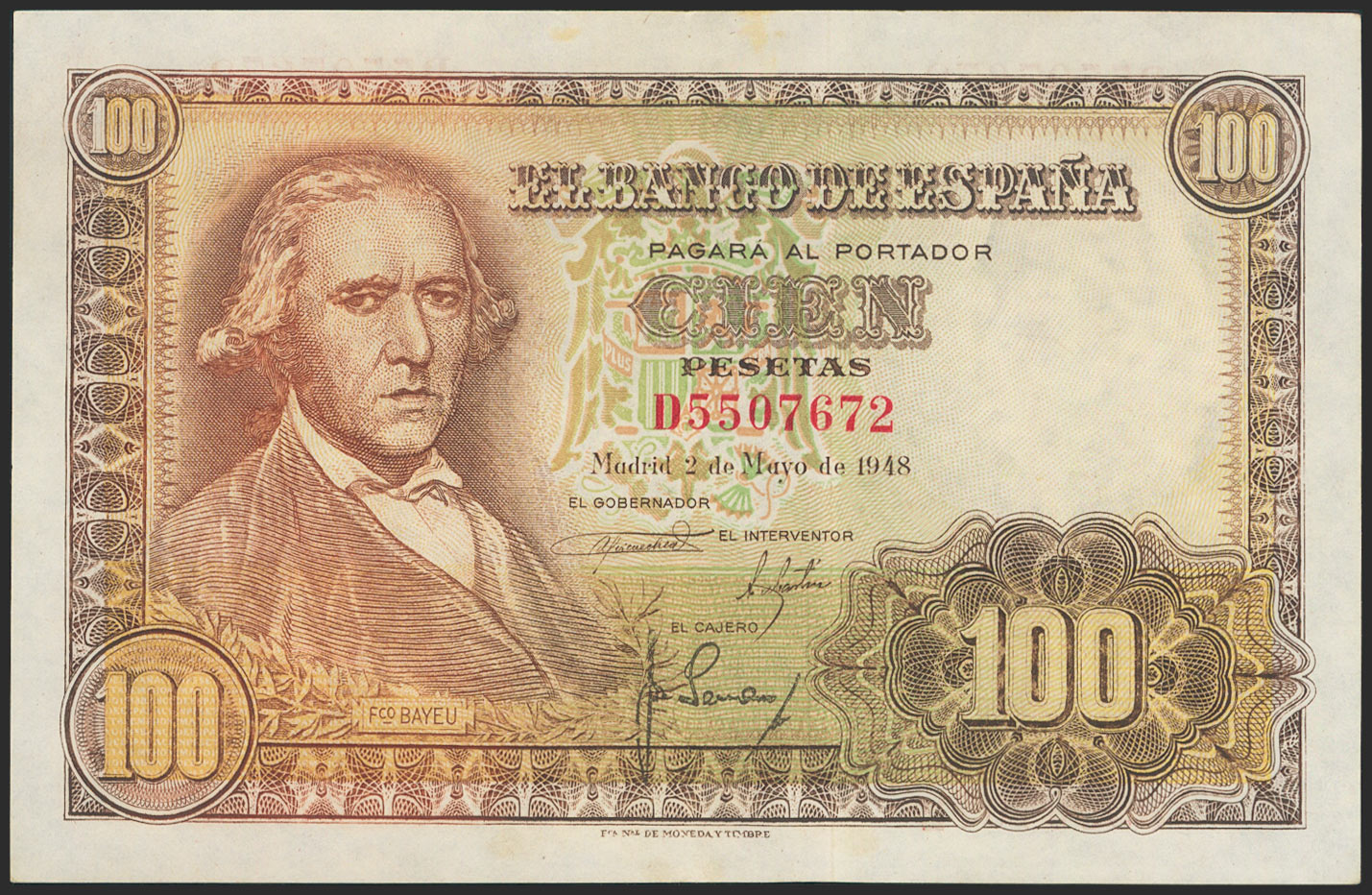 100 Pesetas. May 2, 1948. Series D. (Edifil 2021: 456a). Retains much of its original finish. EF+.
