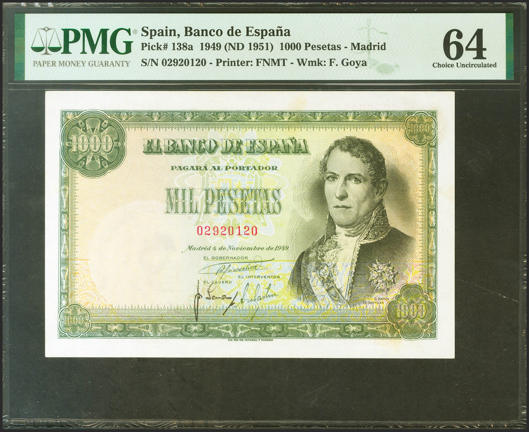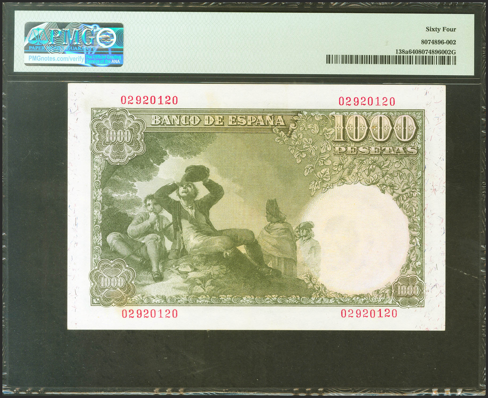 English 1000 Pesetas. November 4, 1949. No serial number. (Edifil 2021: 458, Pick: 138a). Rare in this exceptional condition. Uncirculated. PMG64 package.