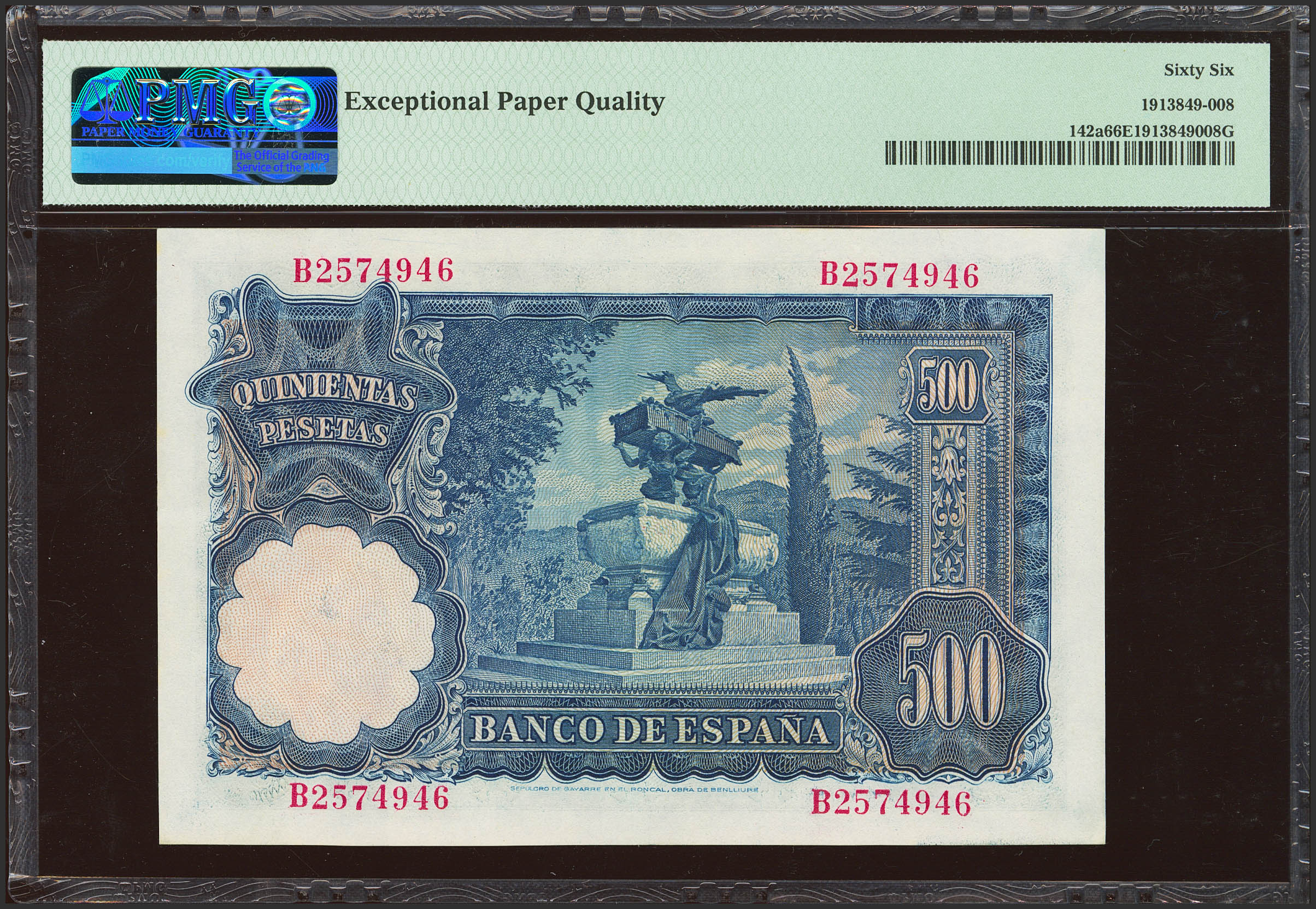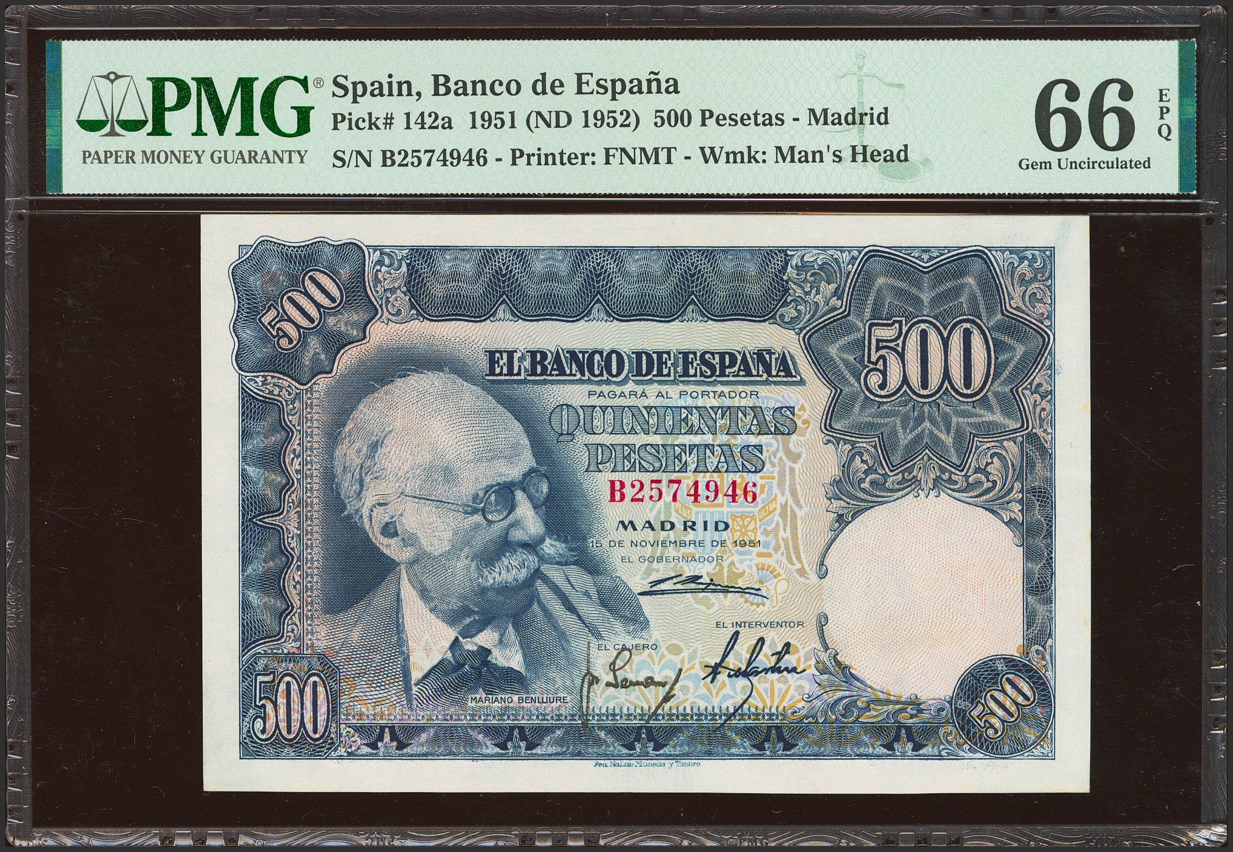 500 Pesetas. November 15, 1951. Series B. (Edifil 2021: 460a, Pick: 142a). Extremely rare in this exceptional condition, original finish. Uncirculated. Encapsulated PMG66EPQ.