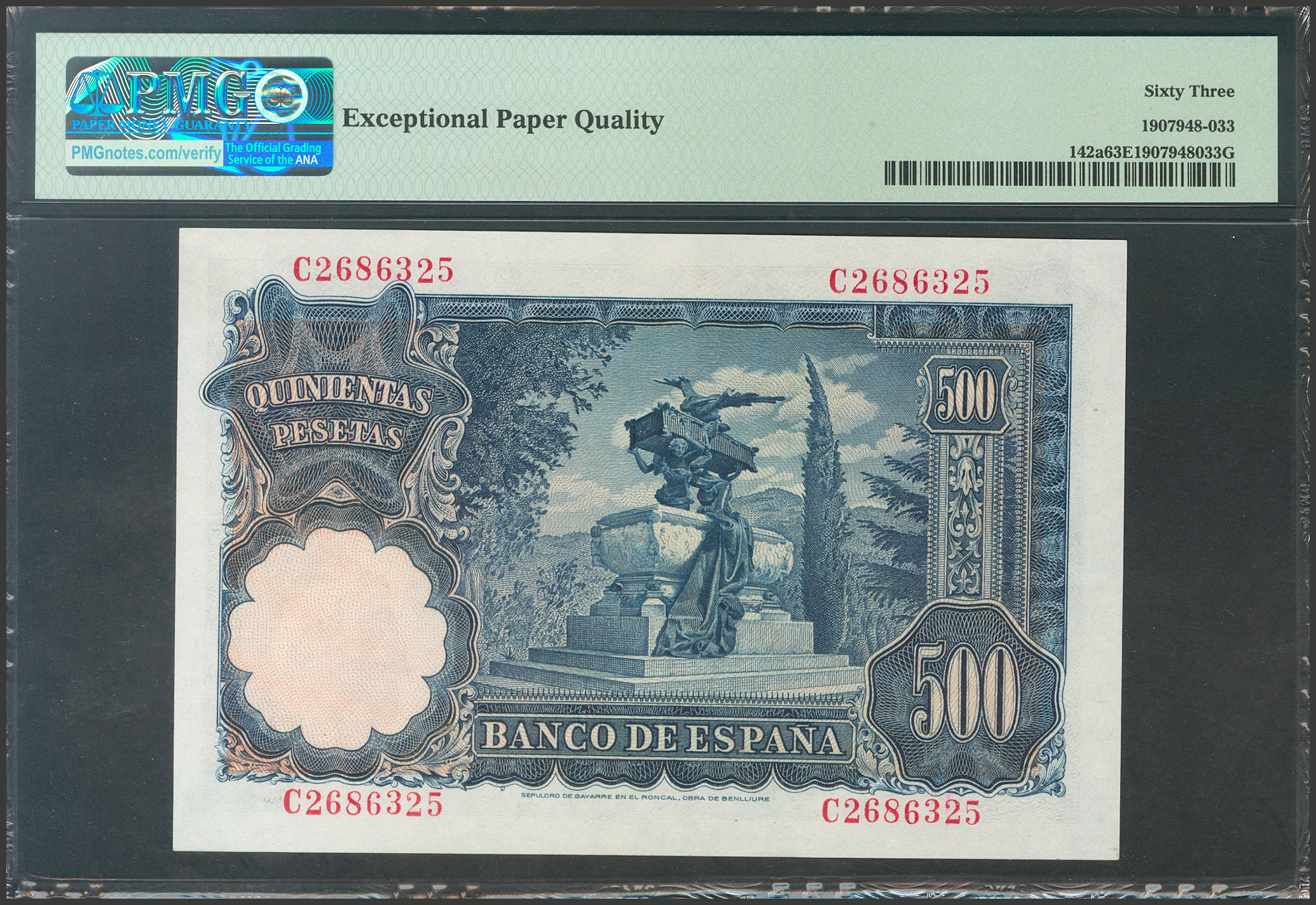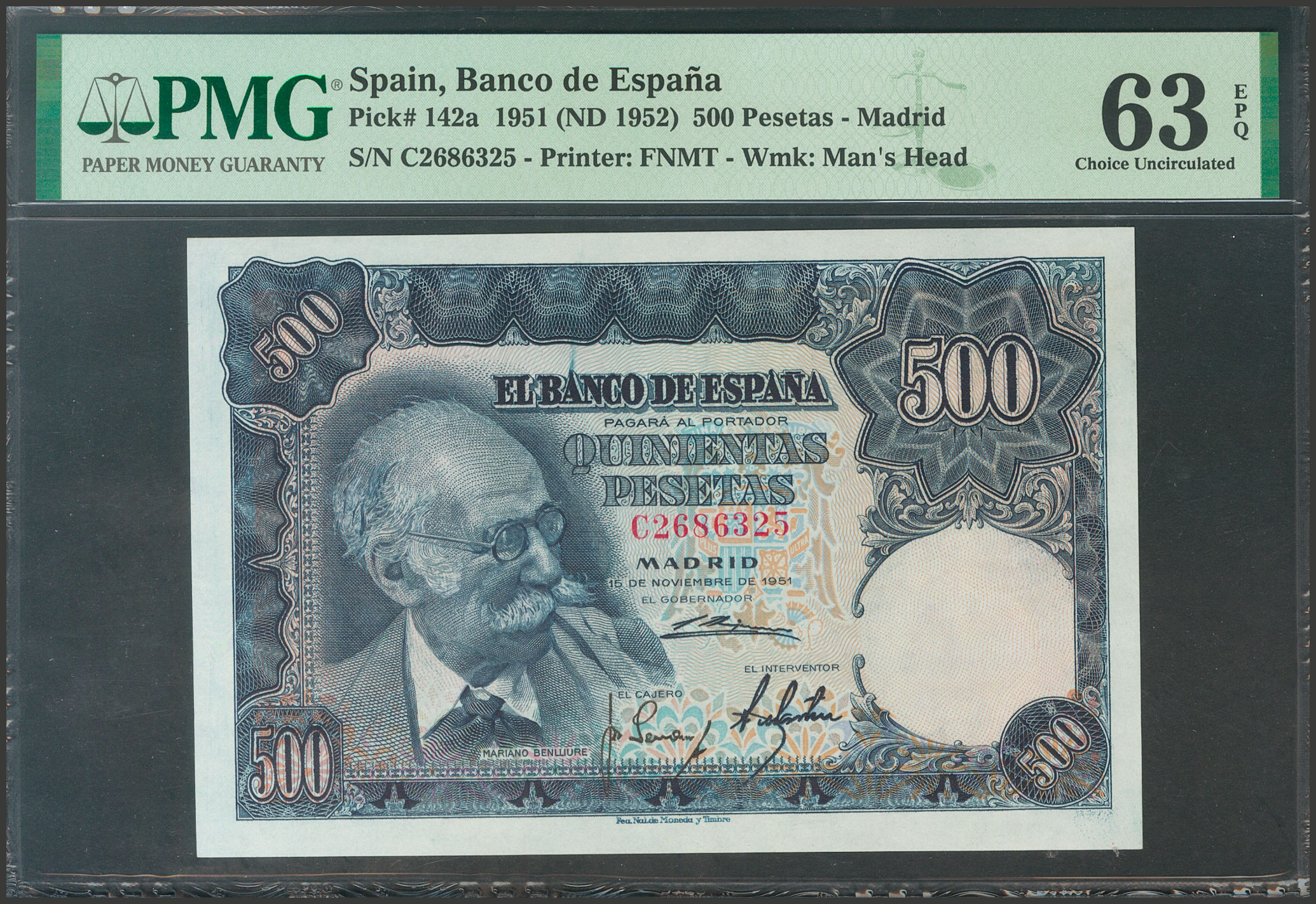 500 Pesetas. November 15, 1951. Series C, last series issued. (Edifil 2017: 460a). Very rare in this condition, it retains all its original finish. PMG63EPQ capsule.