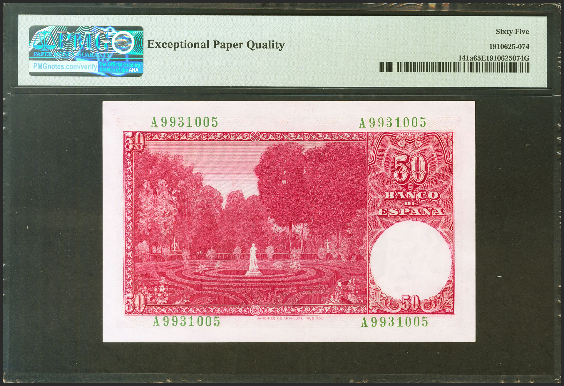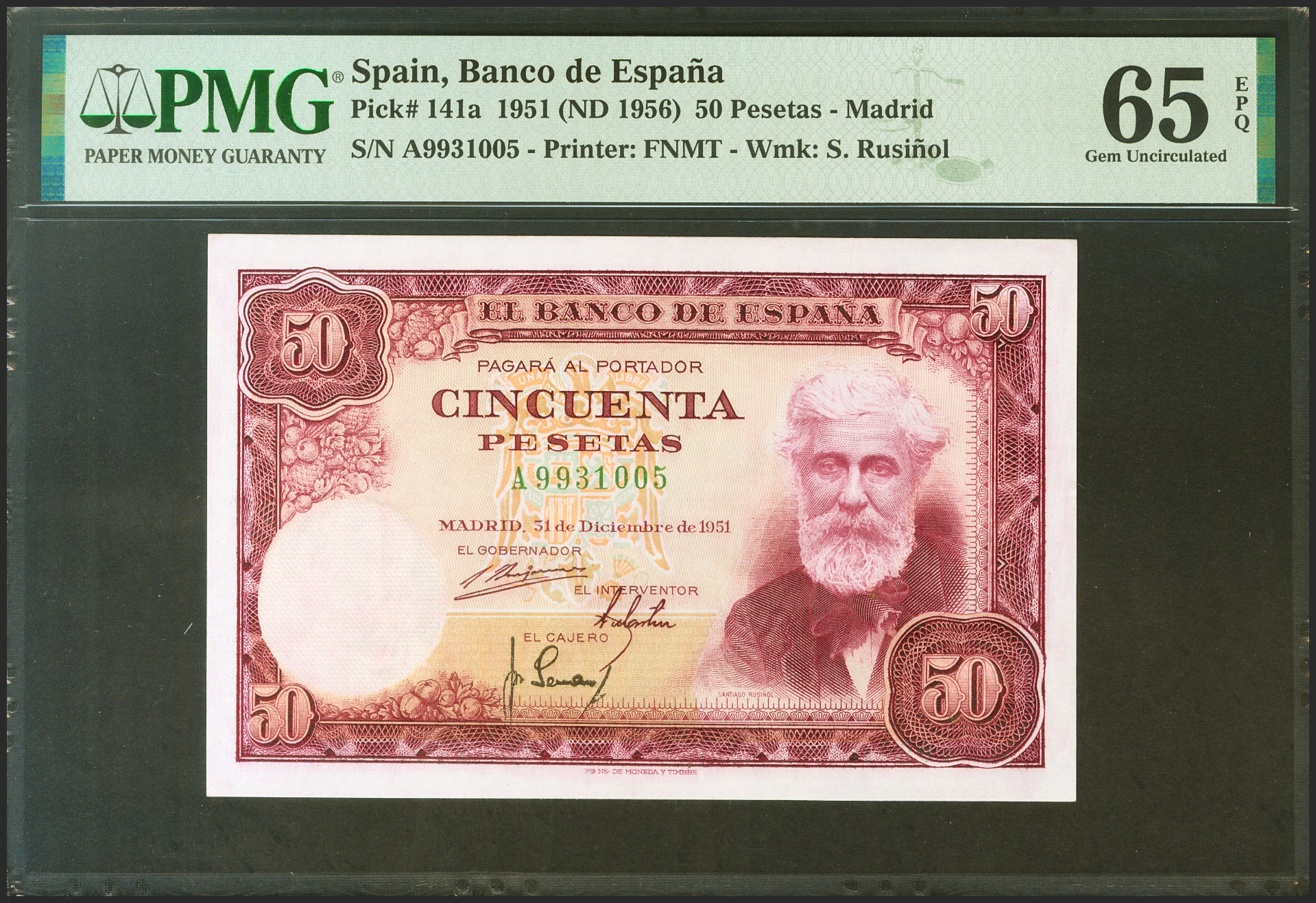 50 Pesetas. December 31, 1951. Series A. (Edifil 2021: 462a, Pick: 141a). Unusual in this condition, original finish. Uncirculated. PMG65EPQ capsule.