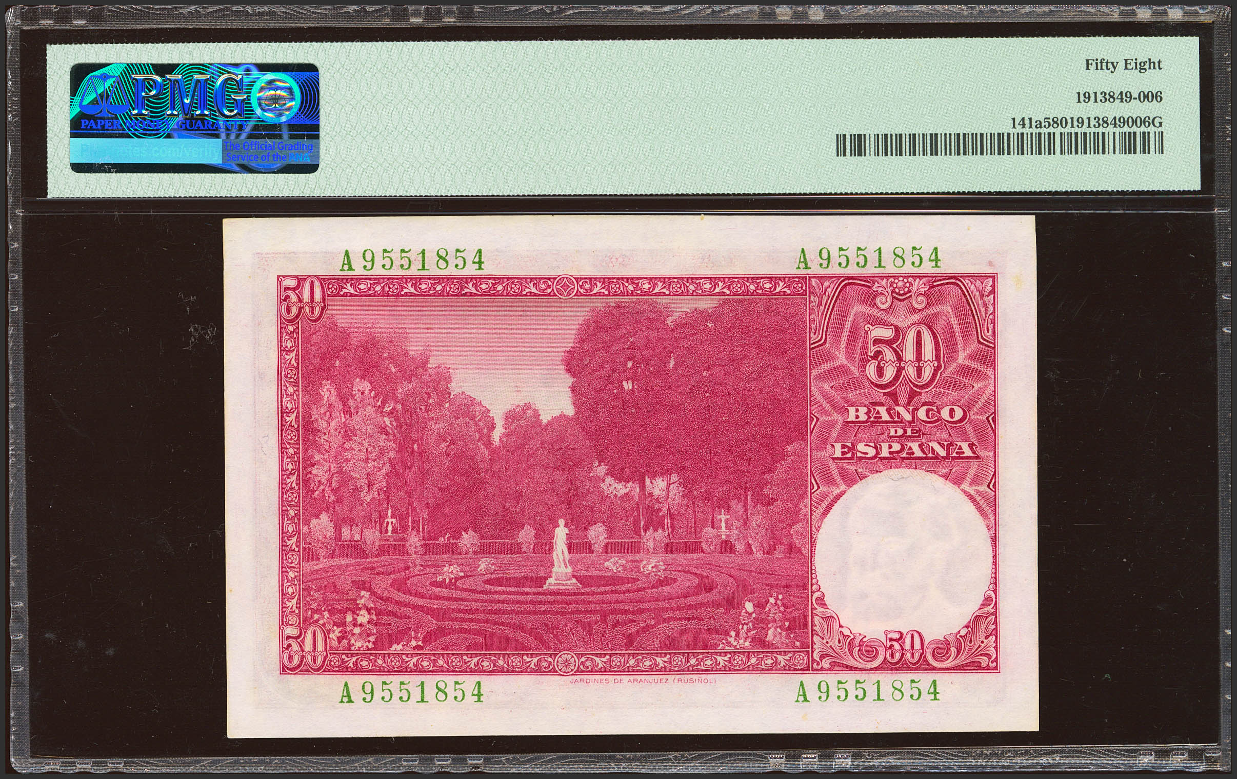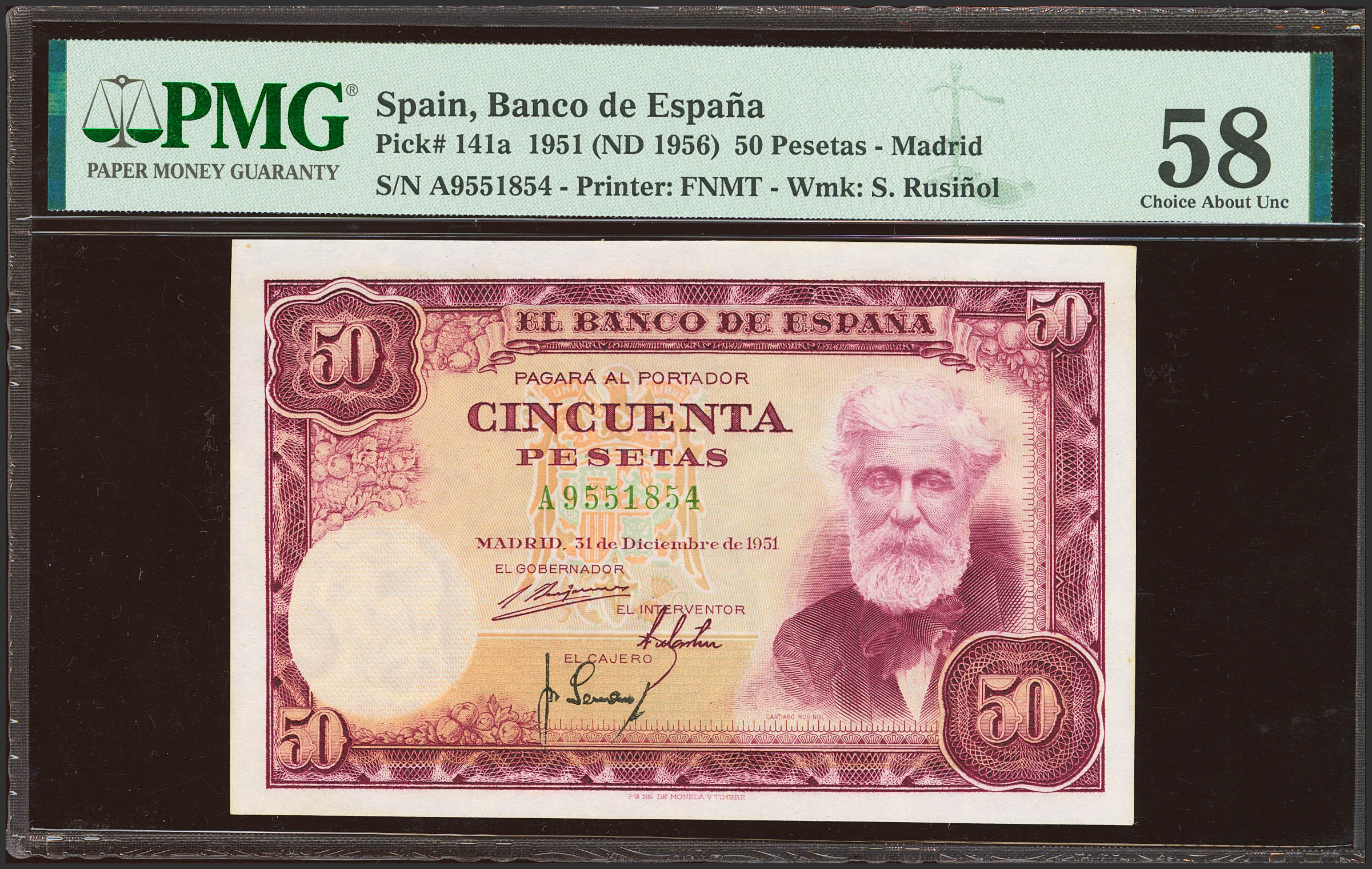 English 50 Pesetas. December 31, 1951. Series A. (Edifil 2021: 462a, Pick: 141a). Good Extremely Fine+. PMG58 package.