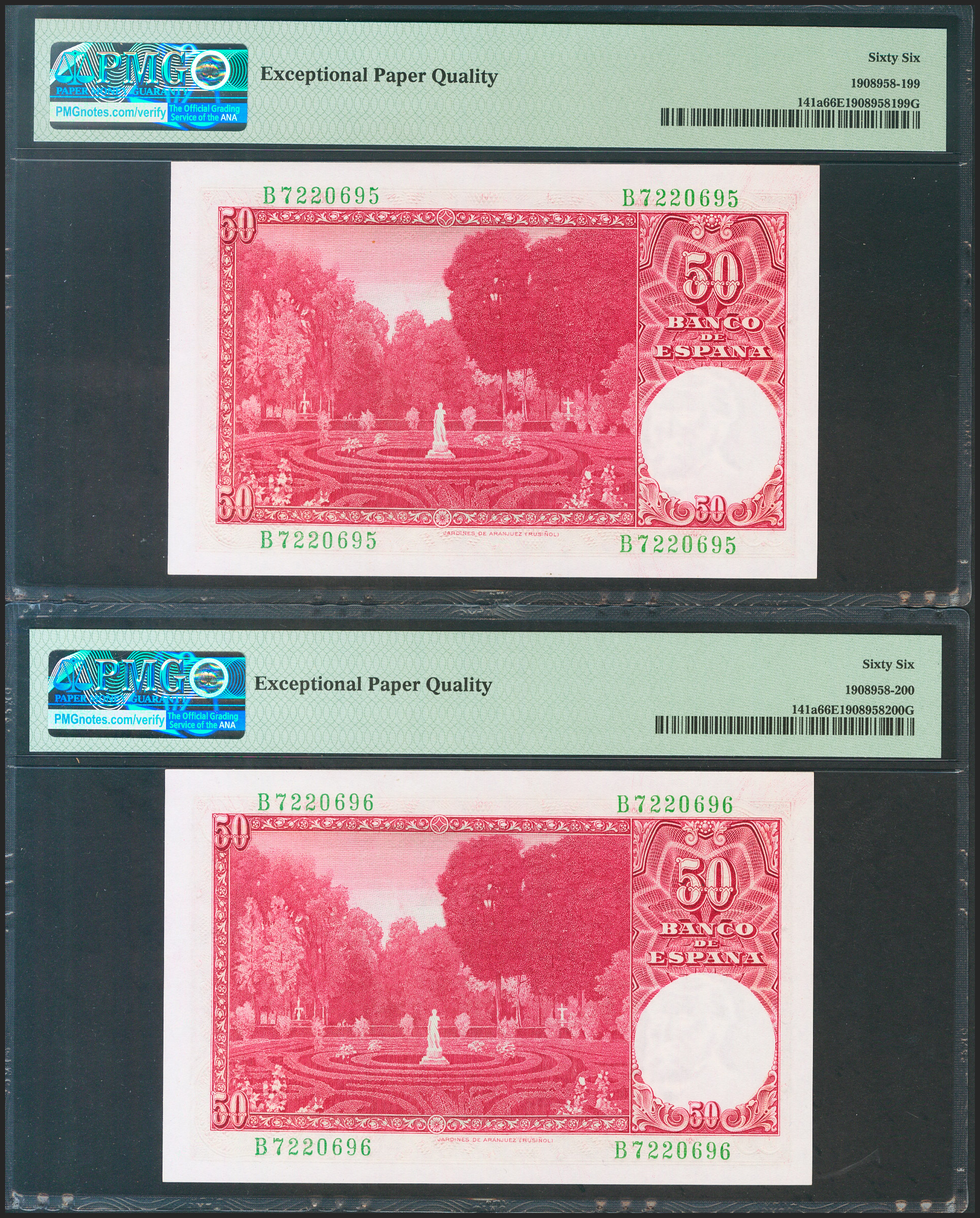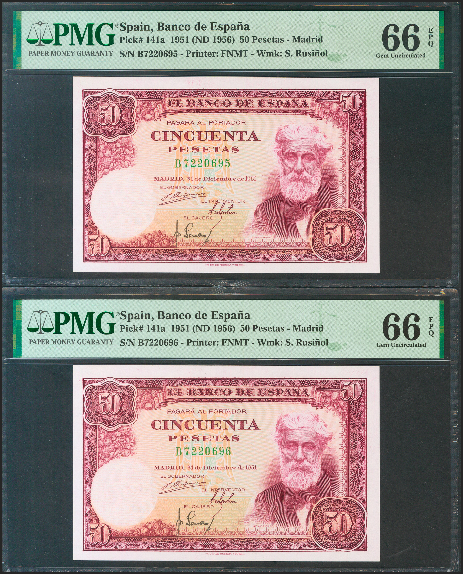 50 Pesetas. December 31, 1951. Consecutive pair. Series B. (Edifil 2021: 462a, Pick: 141a). Extremely rare in this condition, original finish. Uncirculated. PMG66EPQ capsule, both.