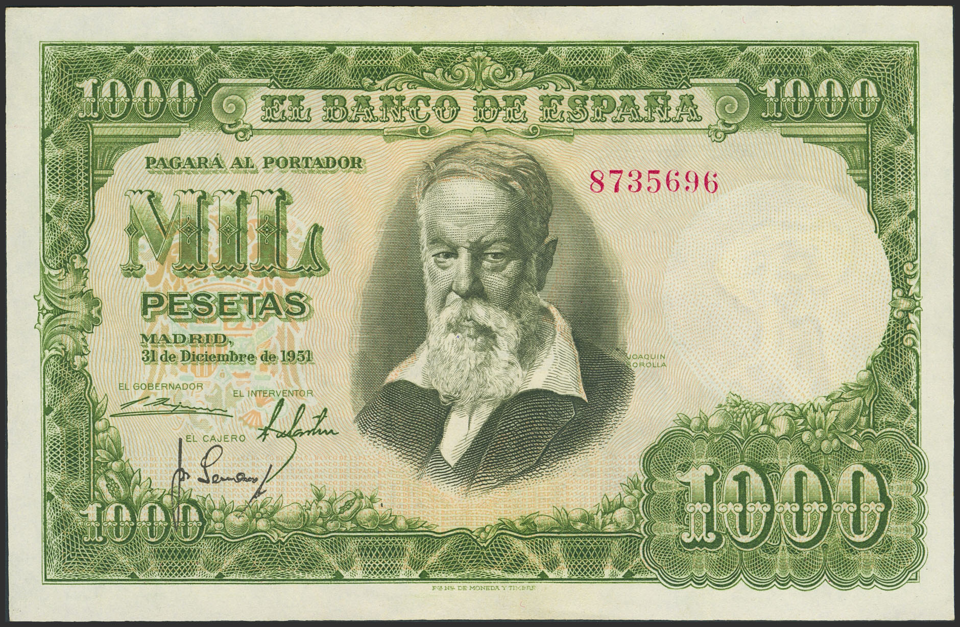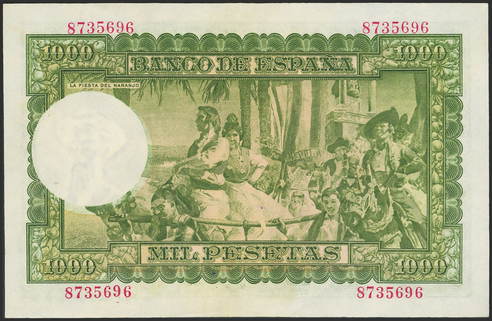 English 1000 Pesetas. December 31, 1951. No series. (Edifil 2017: 463). Retains much of its original finish. EF+.