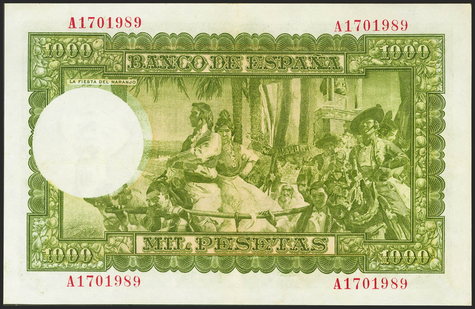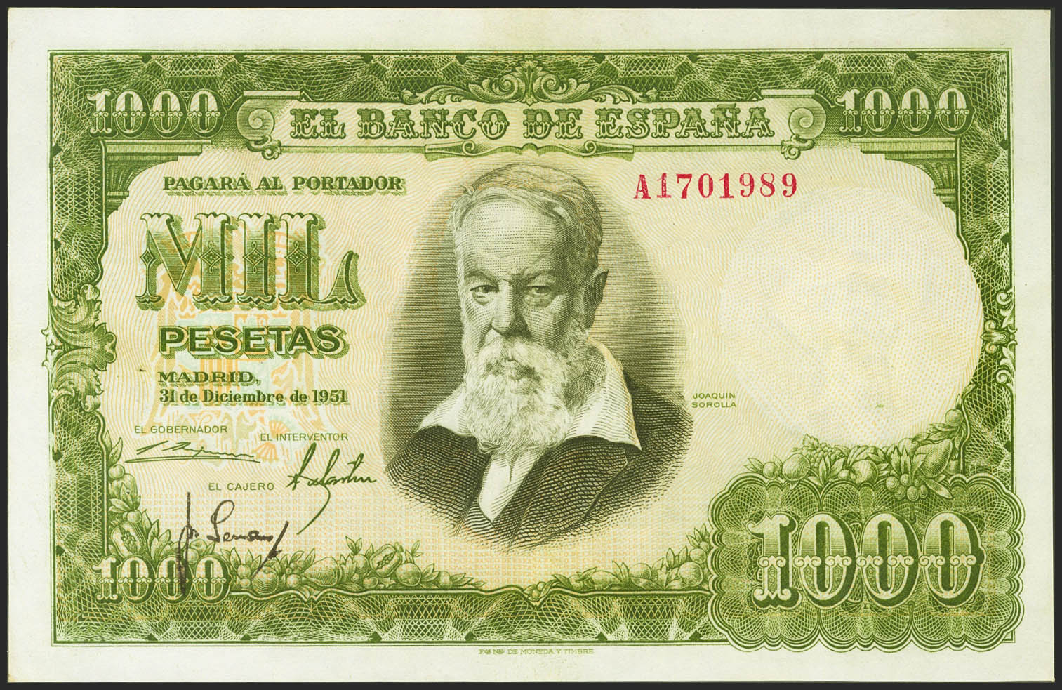 1000 Pesetas. December 31, 1951. Series A. (Edifil 2021: 463a). Retains some of its original finish, staple marks. Extremely Fine.