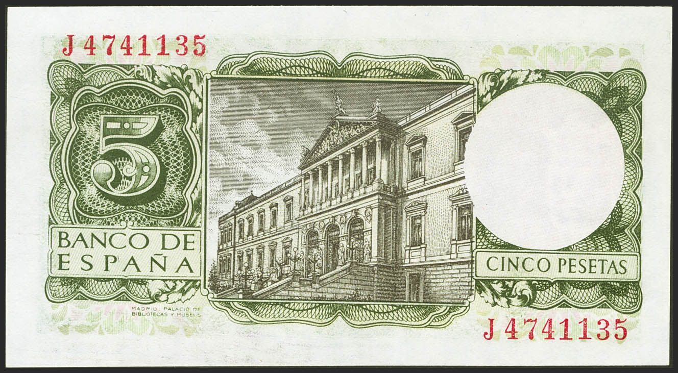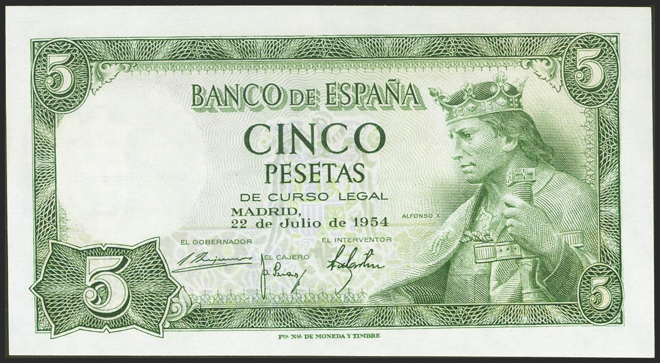 5 Pesetas. July 22, 1954. Series J. (Edifil 2021: 466a). Original finish. Uncirculated.