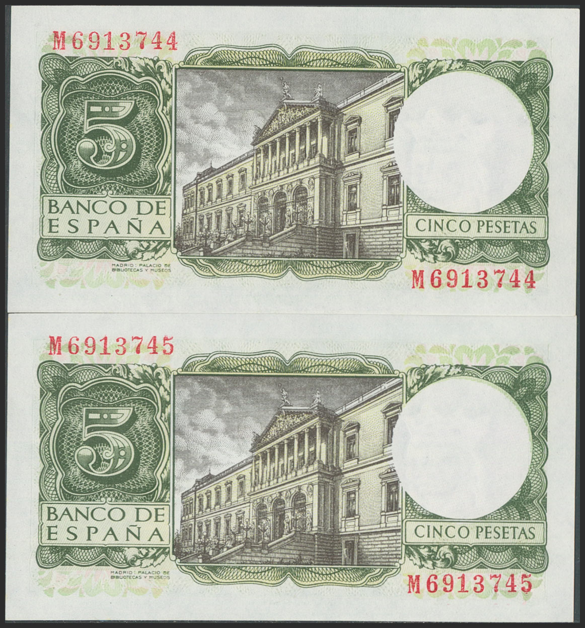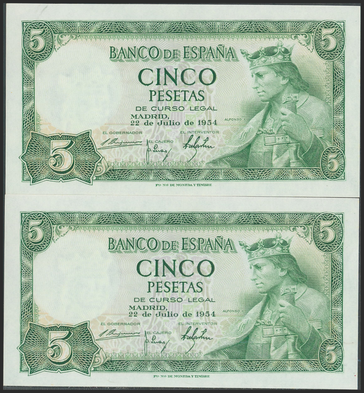 5 Pesetas. July 22, 1954. Consecutive pair. Series M. (Edifil 2017: 466a). Original finish. Uncirculated.