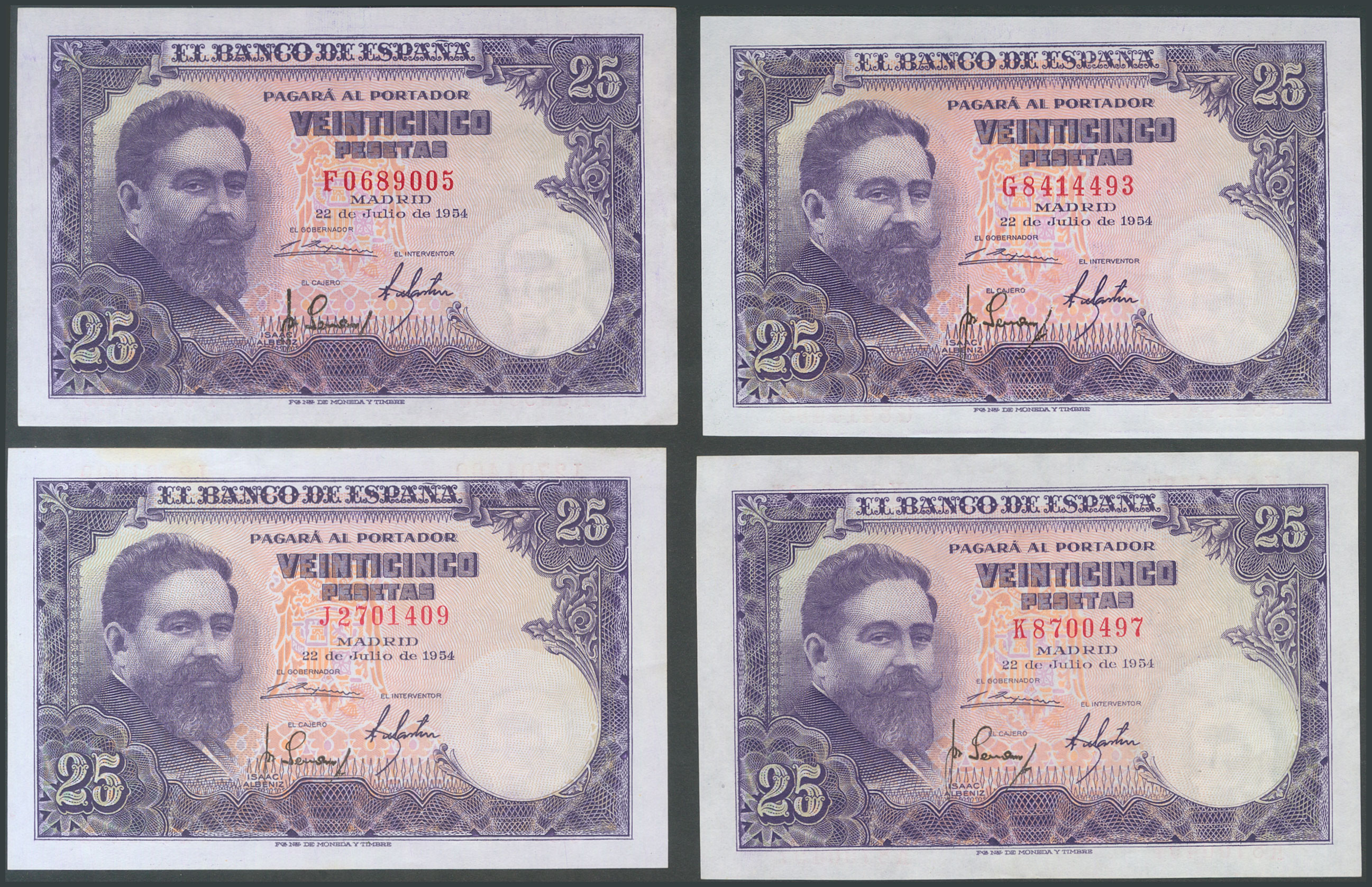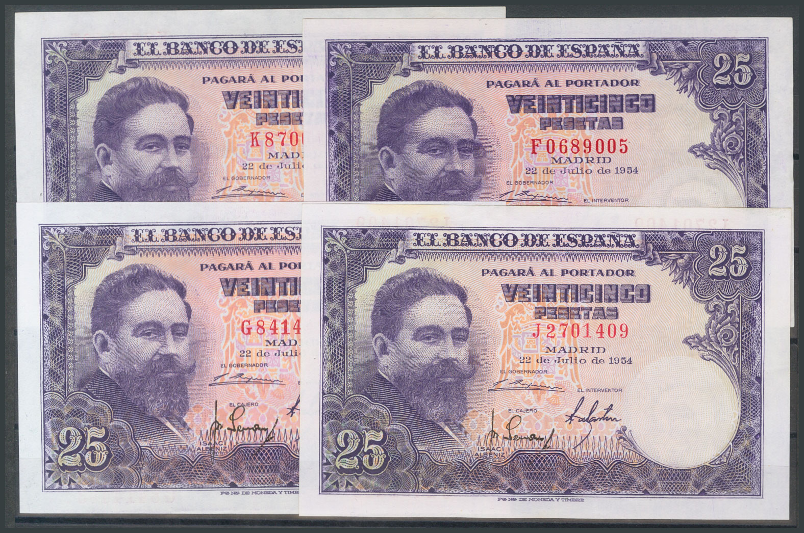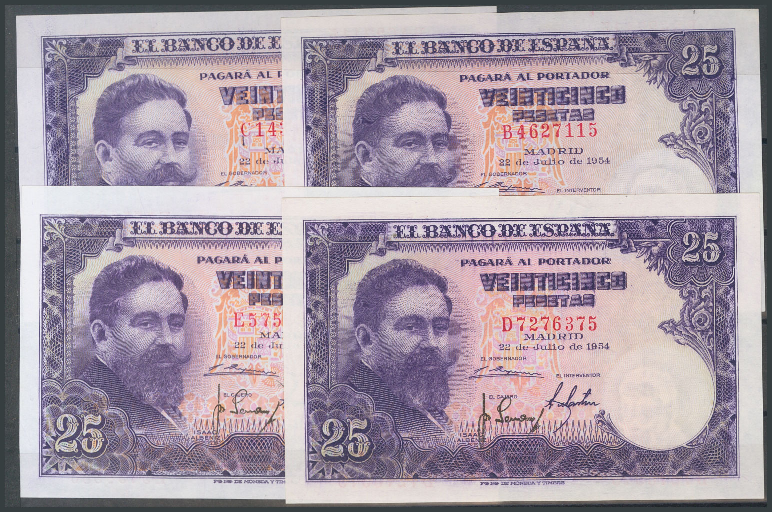 Set of 11 25 Peseta banknotes issued on July 22, 1954, including all series except the "no series", A, H and I (Edifil 2017: 467c). Uncirculated/Extremely Fine.