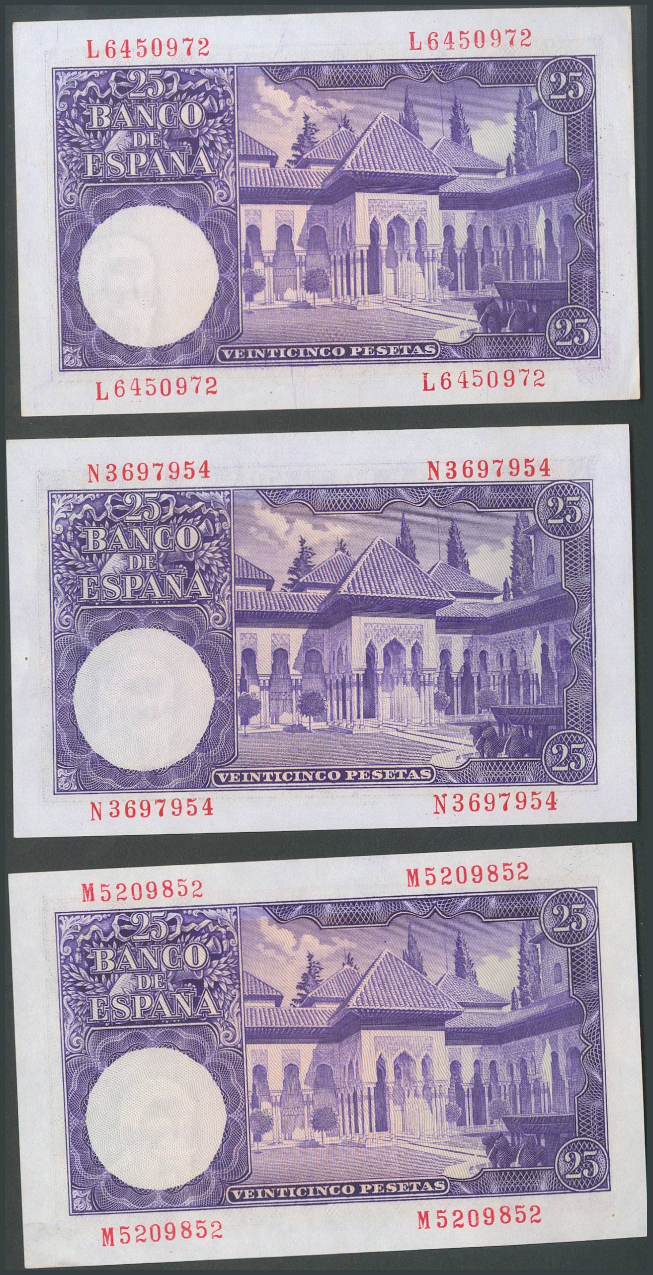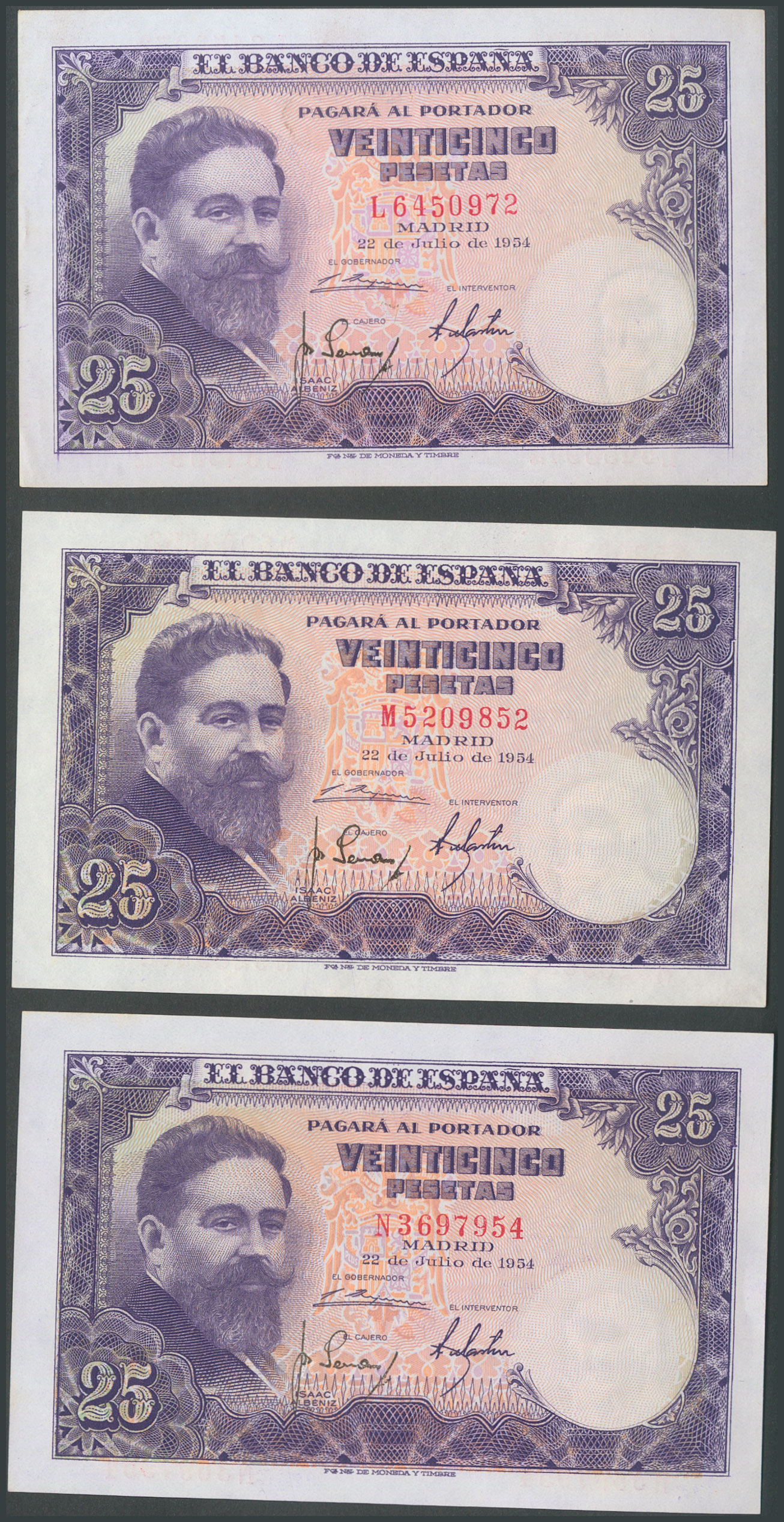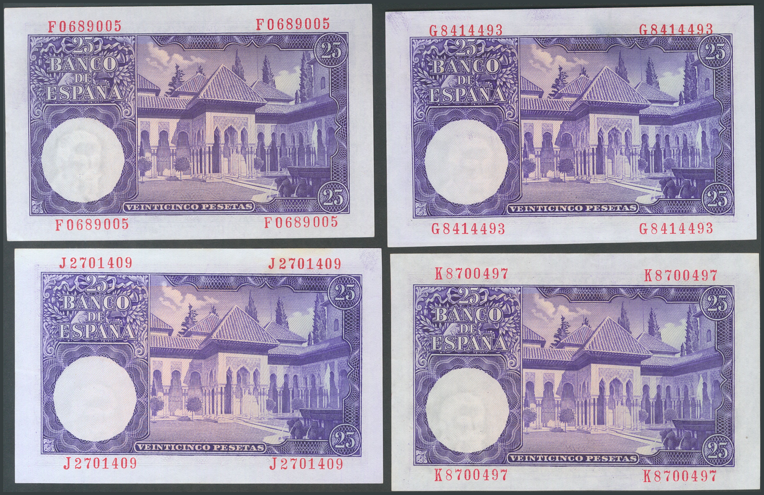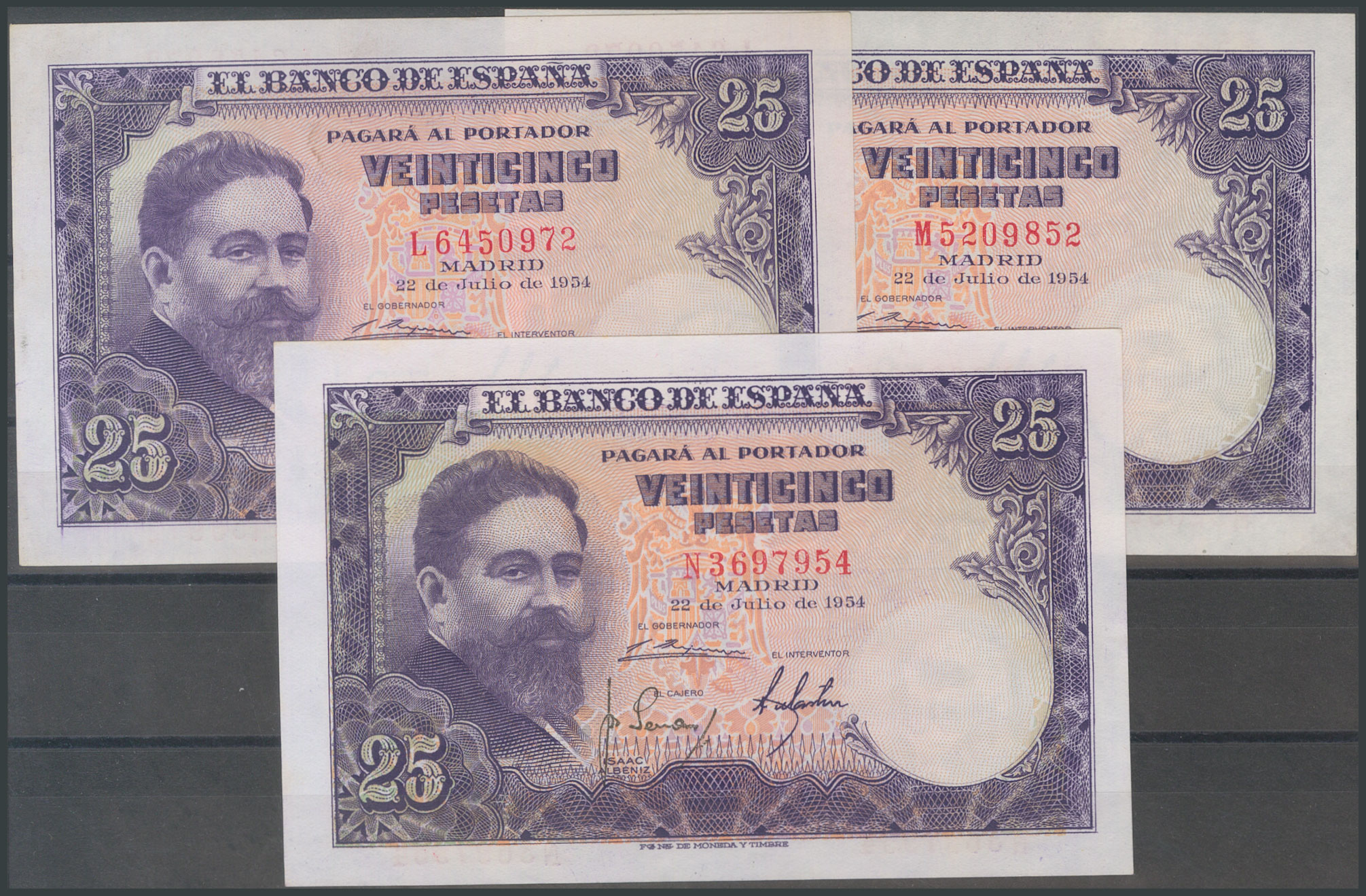 Set of 11 25 Peseta banknotes issued on July 22, 1954, including all series except the "no series", A, H and I (Edifil 2017: 467c). Uncirculated/Extremely Fine.