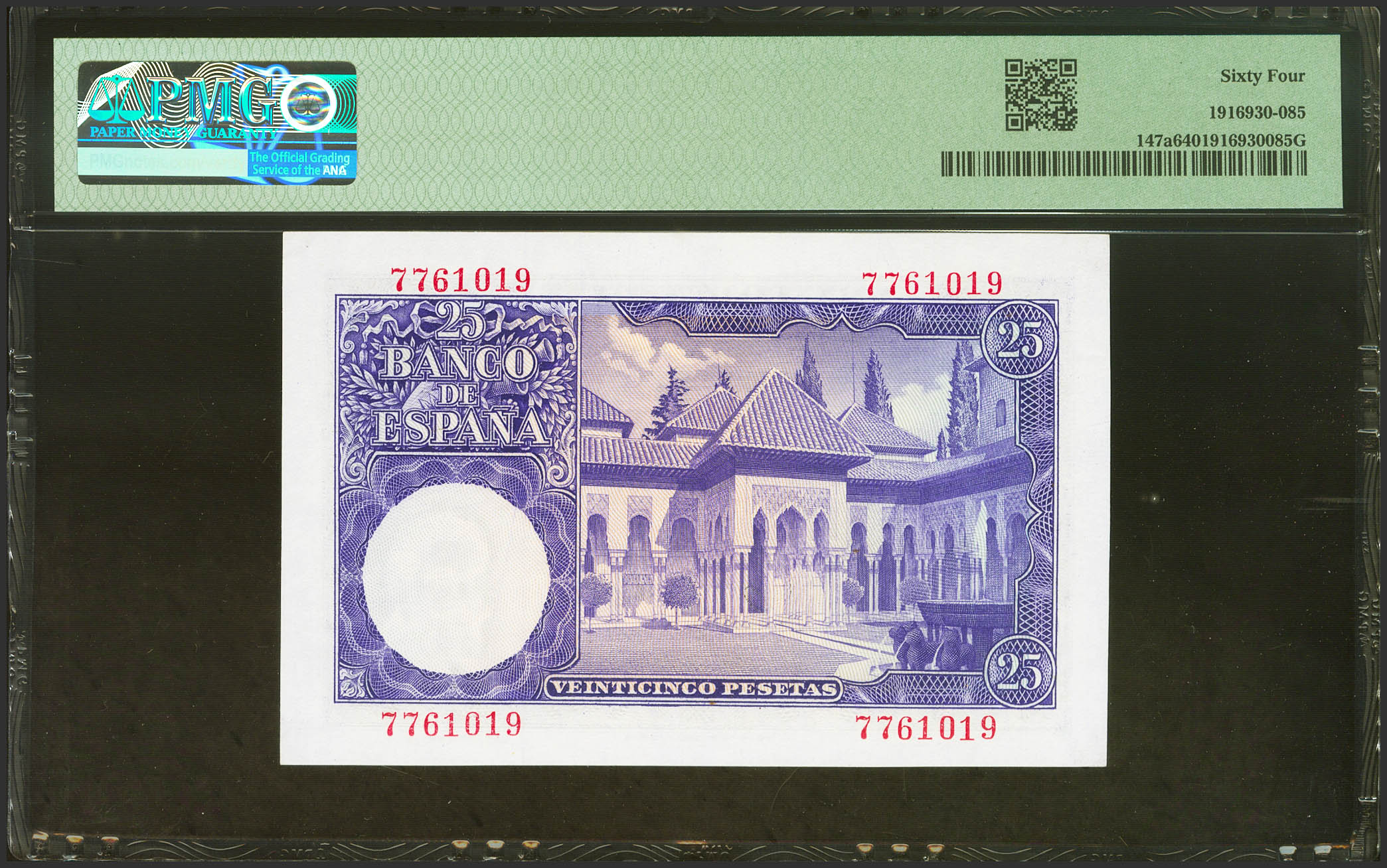 25 Pesetas. July 22, 1954. No serial number. (Edifil 2023: 467, Pick: 147a). Unusual. Uncirculated. PMG64 package.