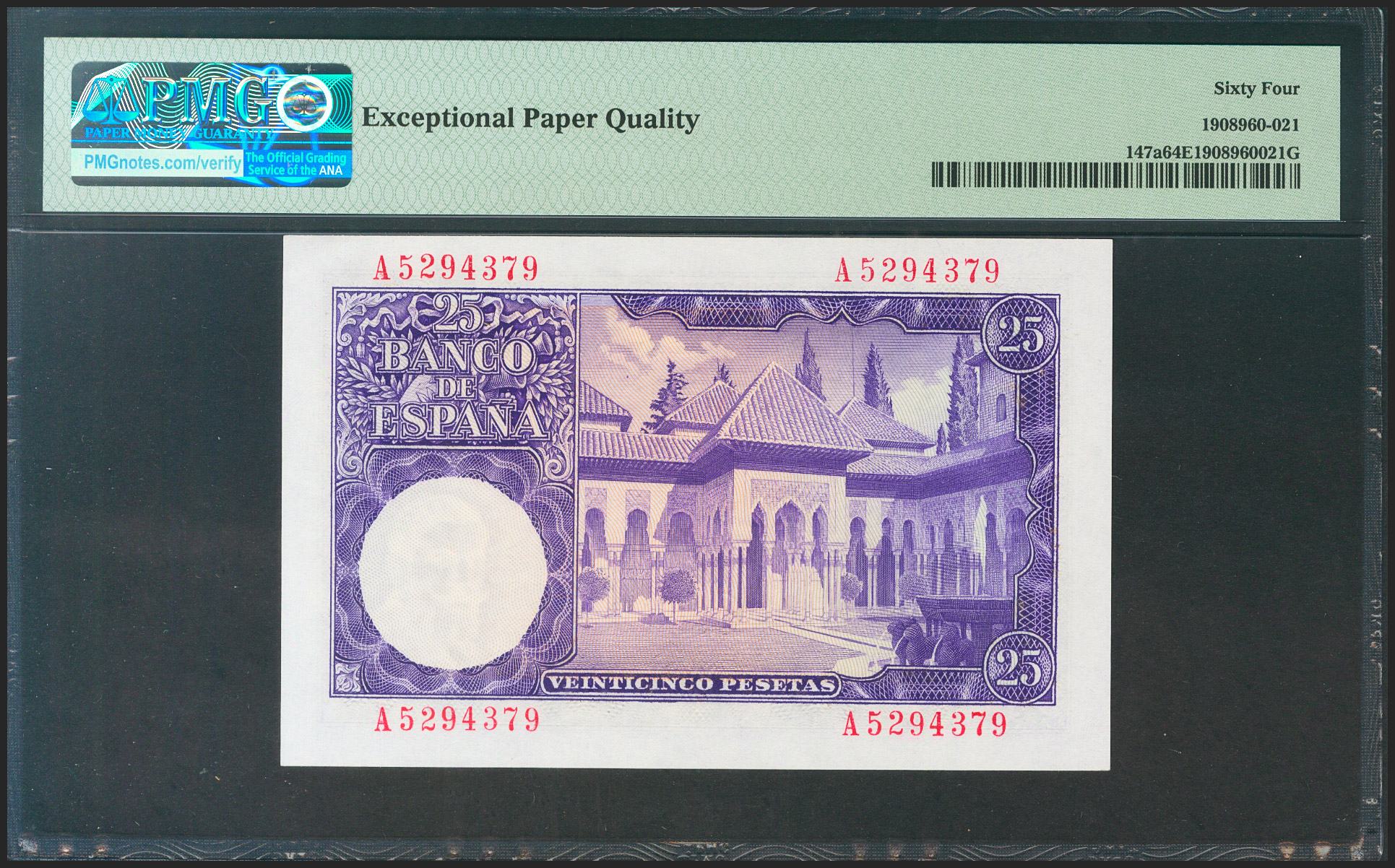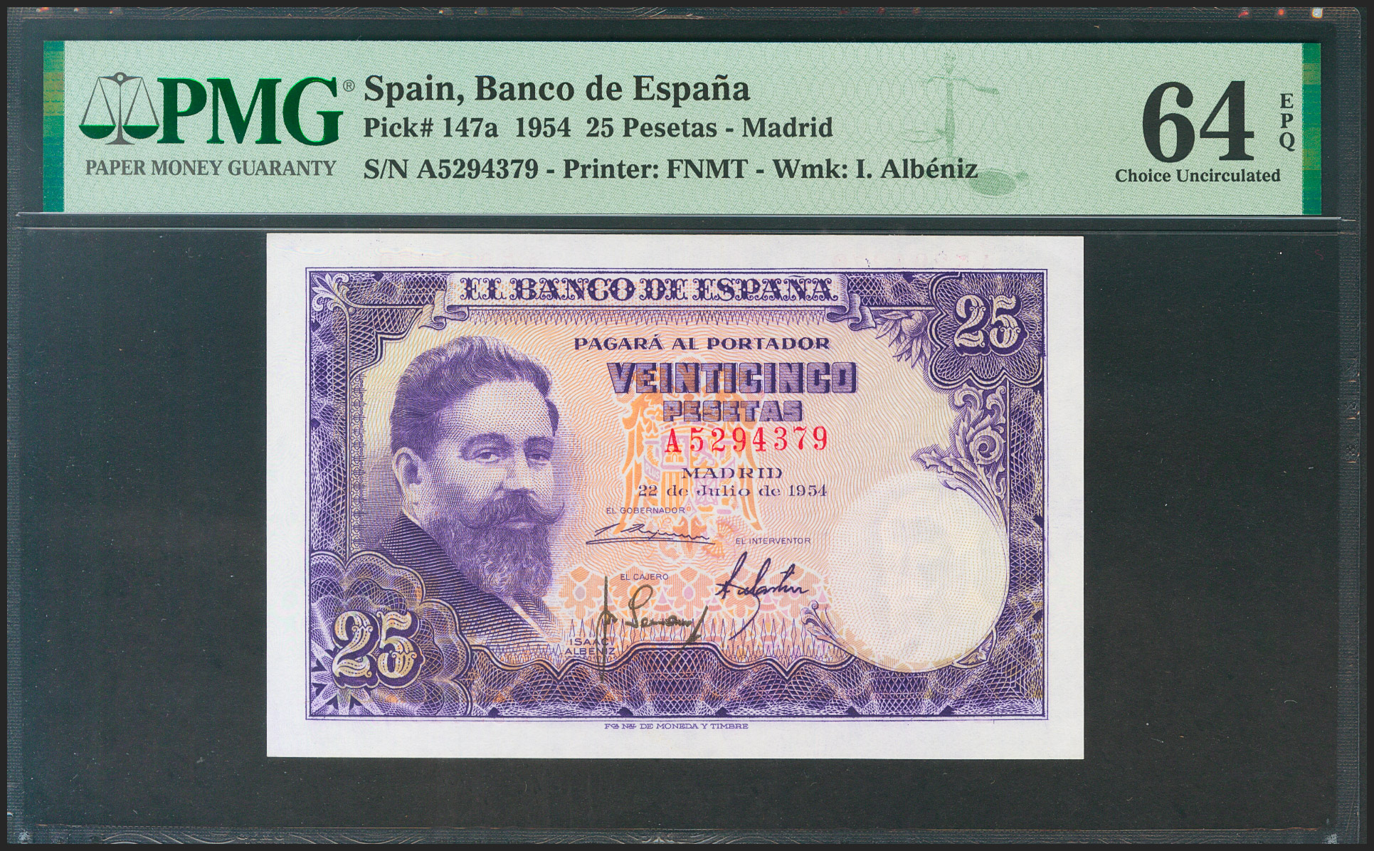 English 25 Pesetas. July 22, 1954. Series A. (Edifil 2021: 467a, Pick: 147a). Unusual in this condition, original finish. Uncirculated. PMG64EPQ capsule.