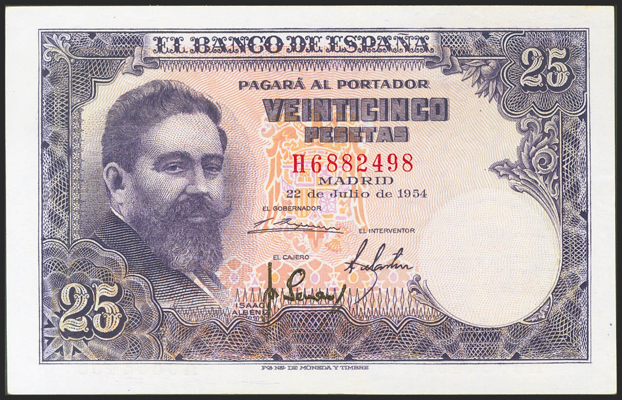 25 Pesetas. July 22, 1954. Series H (Edifil 2021: 467a). Original finish. Uncirculated.