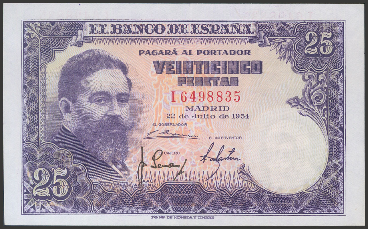 25 Pesetas. July 22, 1954. Series I. (Edifil 2017: 467a). Original condition. EF+.