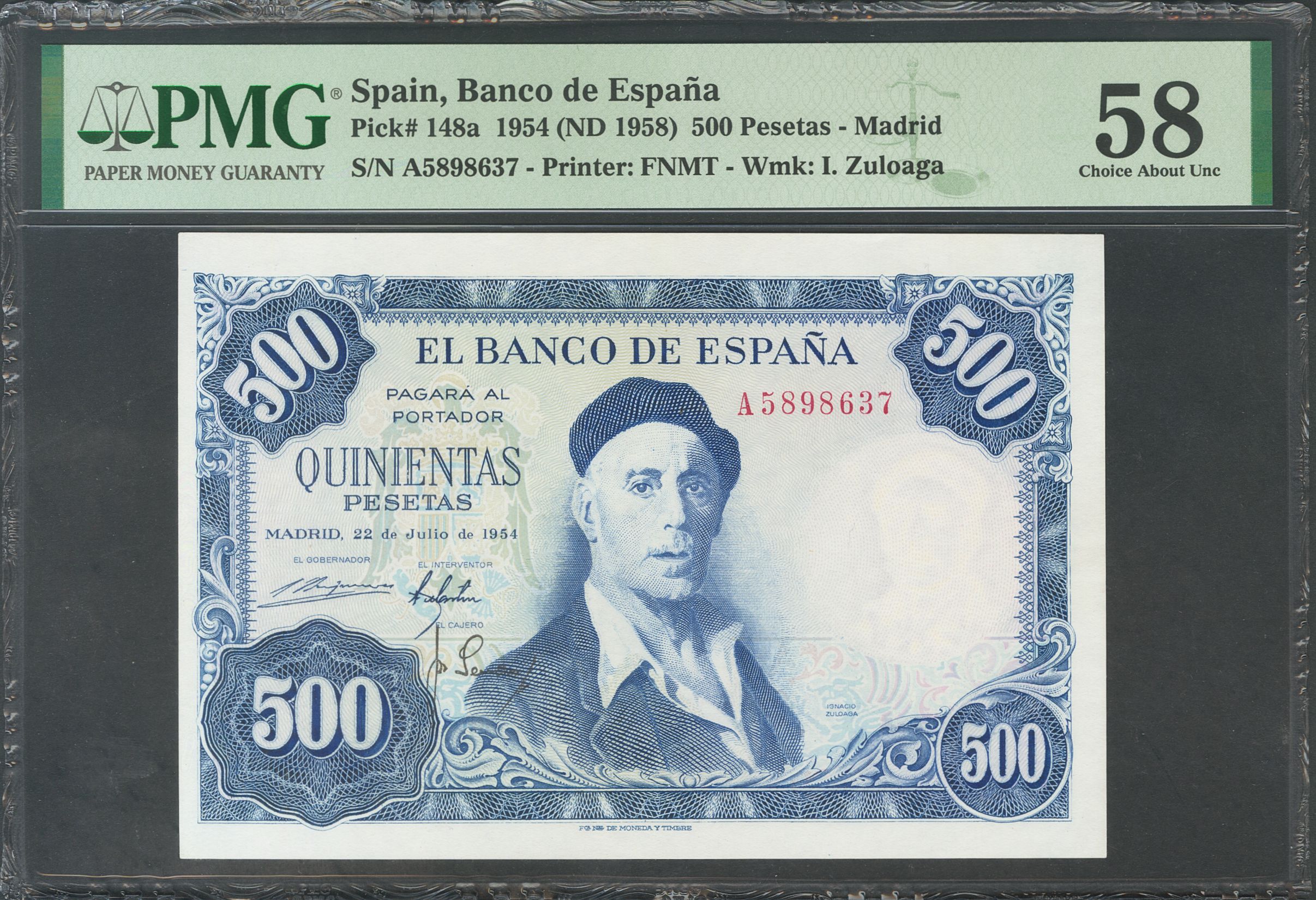 500 Pesetas. July 22, 1954. Series A. (Edifil 2017: 468a). EF+. PMG58 package.