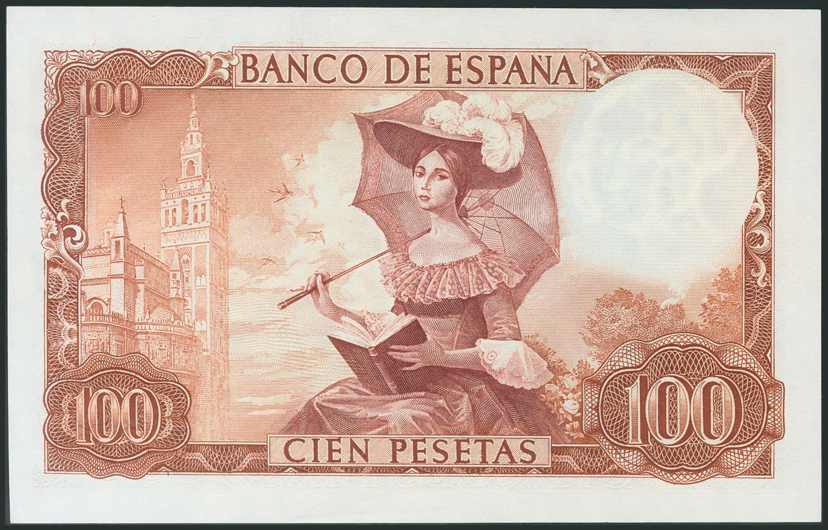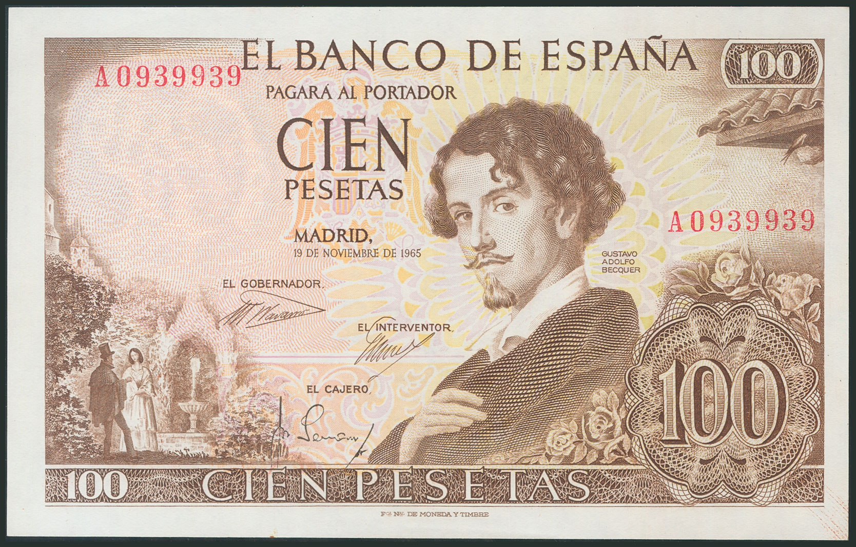 100 Pesetas. November 19, 1965. Series A and imperfect palindromic numbering A0939939. (Edifil 2017: 470a). Uncirculated.