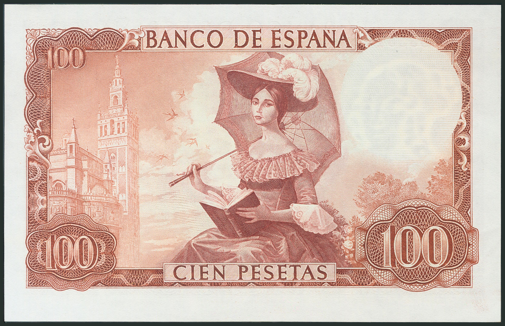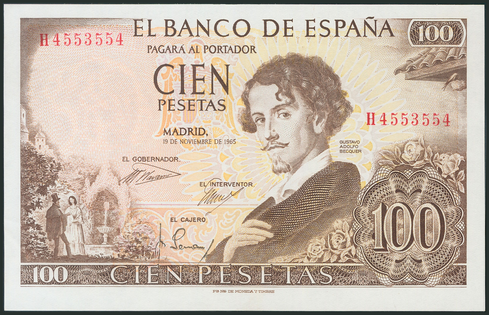 100 Pesetas. November 19, 1965. Series H and palindromic numbering H4553554. (Edifil 2017: 470a). Uncirculated.