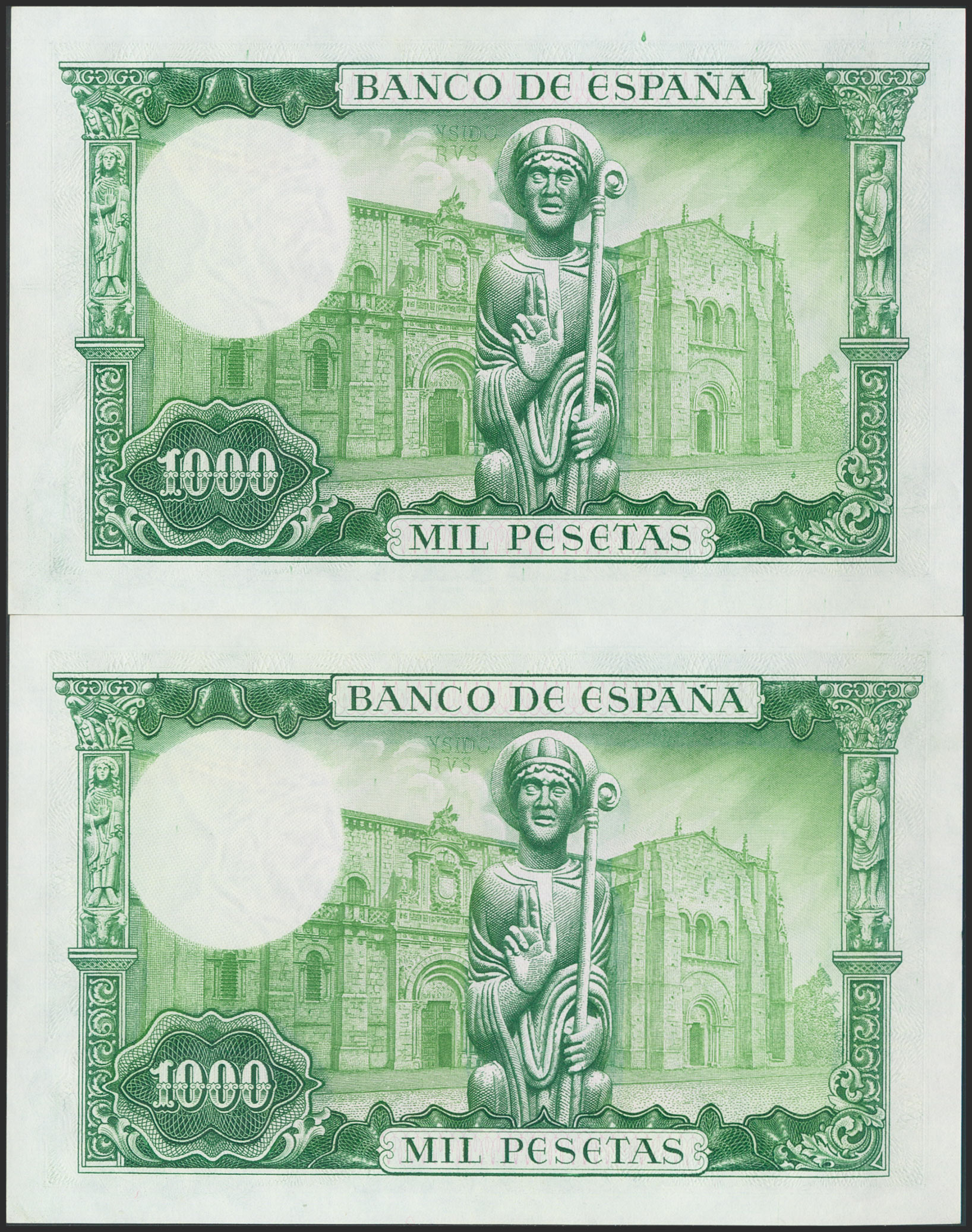 English 1000 Pesetas. November 19, 1965. Consecutive pair. Series E. (Edifil 2017: 471b). Original finish. Uncirculated-.