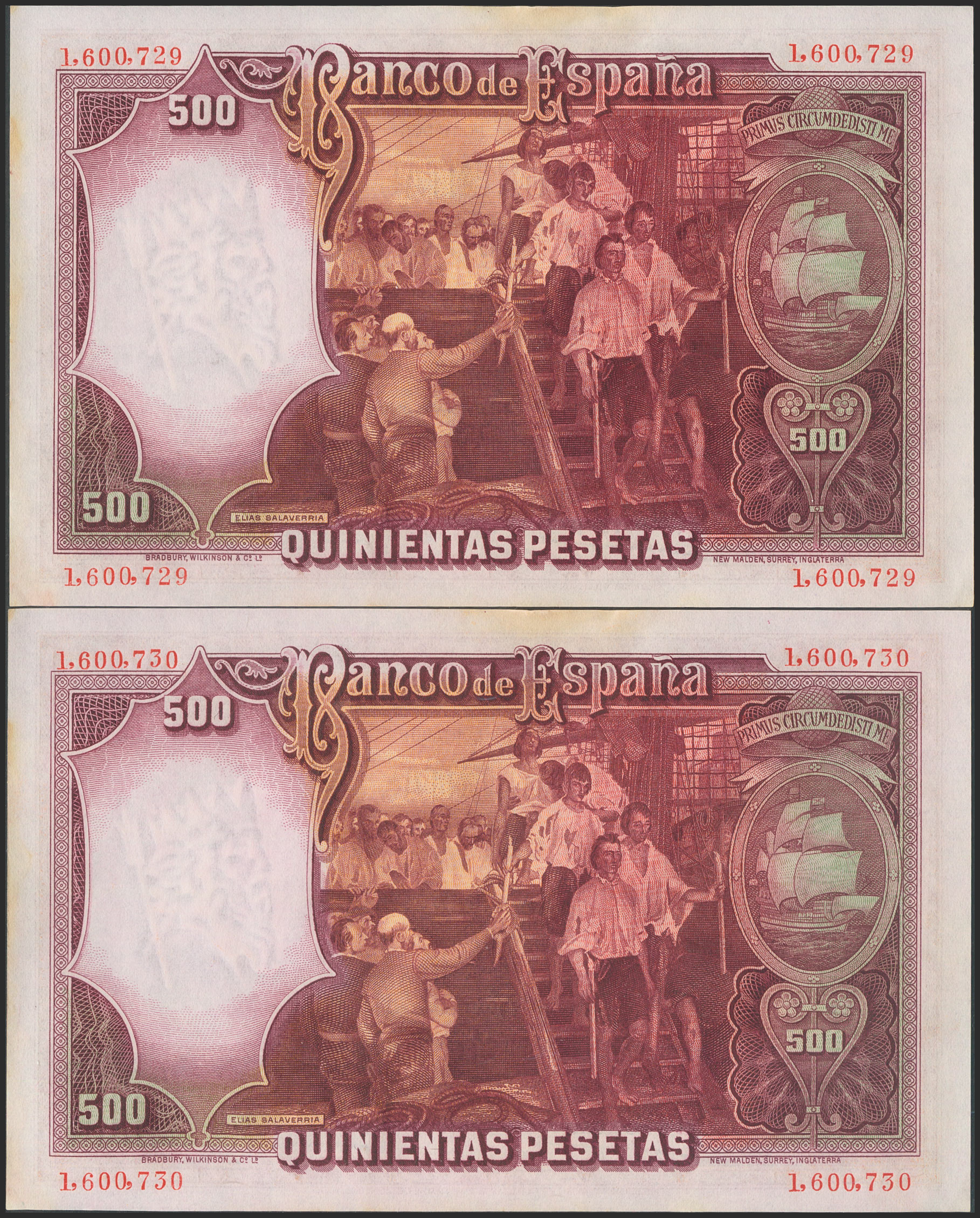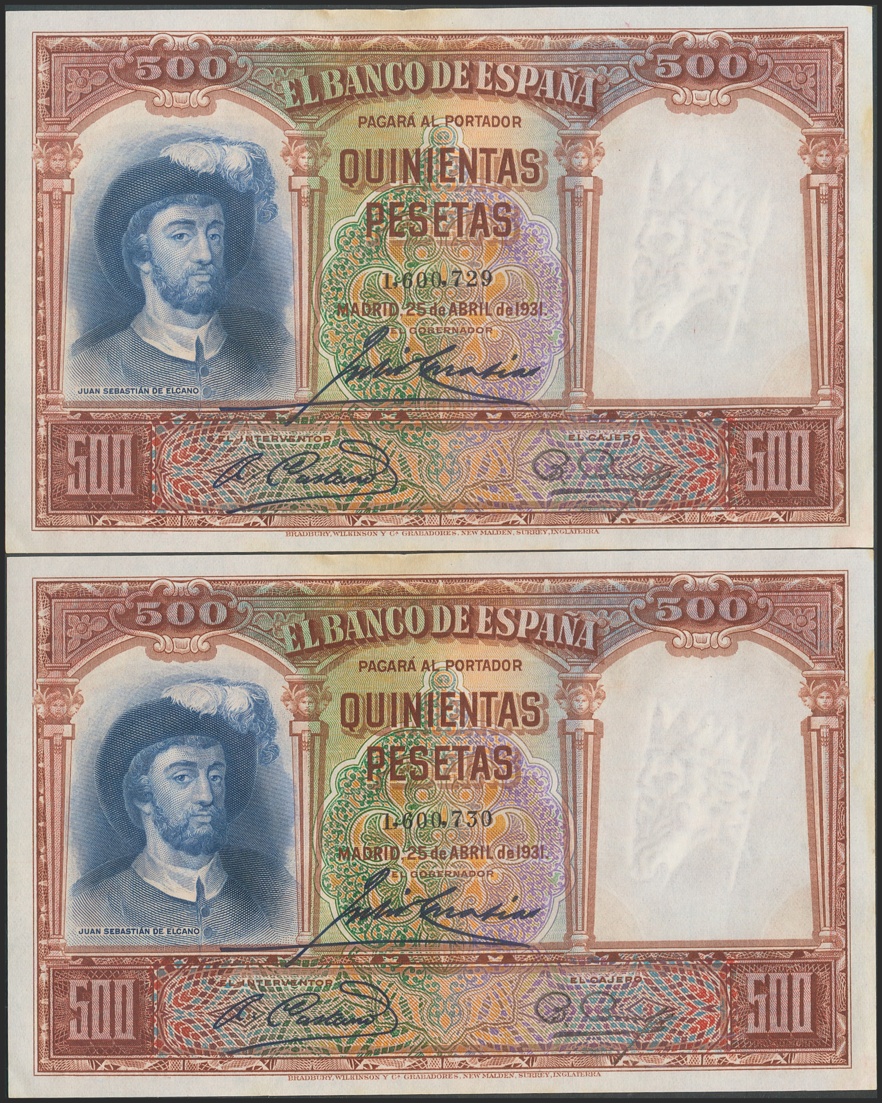 500 Pesetas. April 25, 1931. Consecutive pair. No series. (Edifil 2017: 361). Retains all its original finish, small stains on the upper margin. EF+.