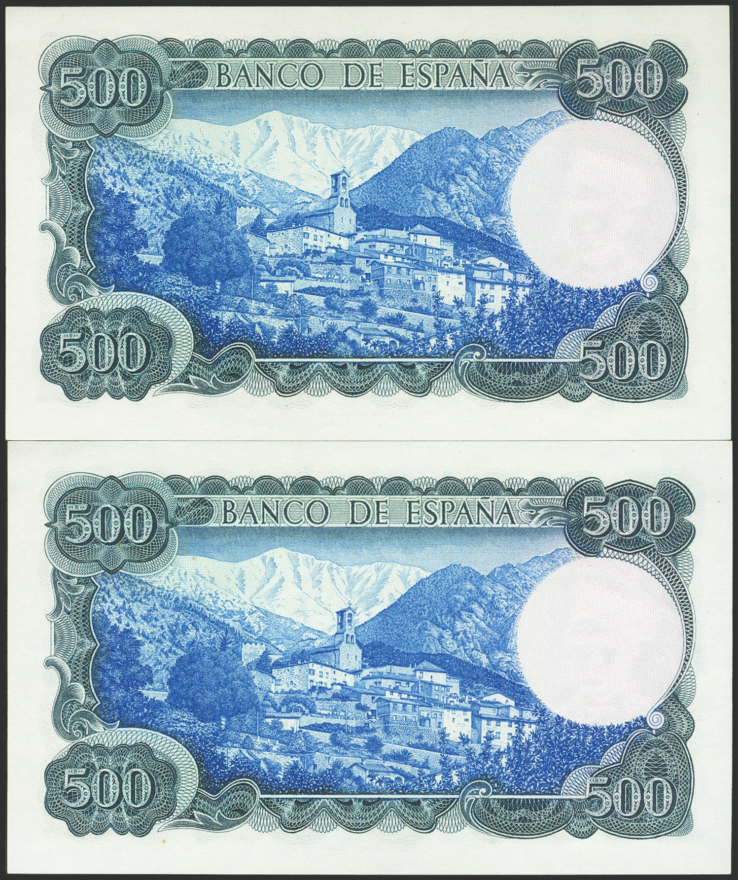 500 Pesetas. July 23, 1971. Consecutive pair. Series N. (Edifil 2023: 473a). Retains all its original finish. Uncirculated-.
