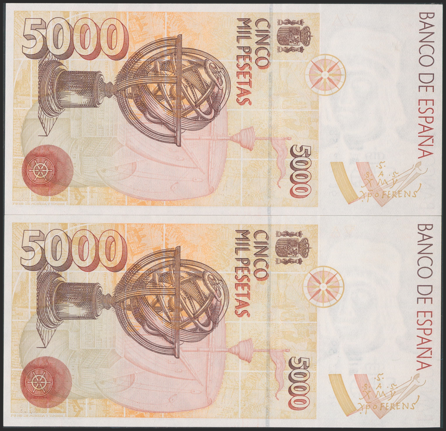 5000 Pesetas. October 12, 1992. Consecutive pair. Series 9C, special numbering. (Edifil 2017: 484c). Natural waviness inherent to the printing process, of no importance. Uncirculated-.