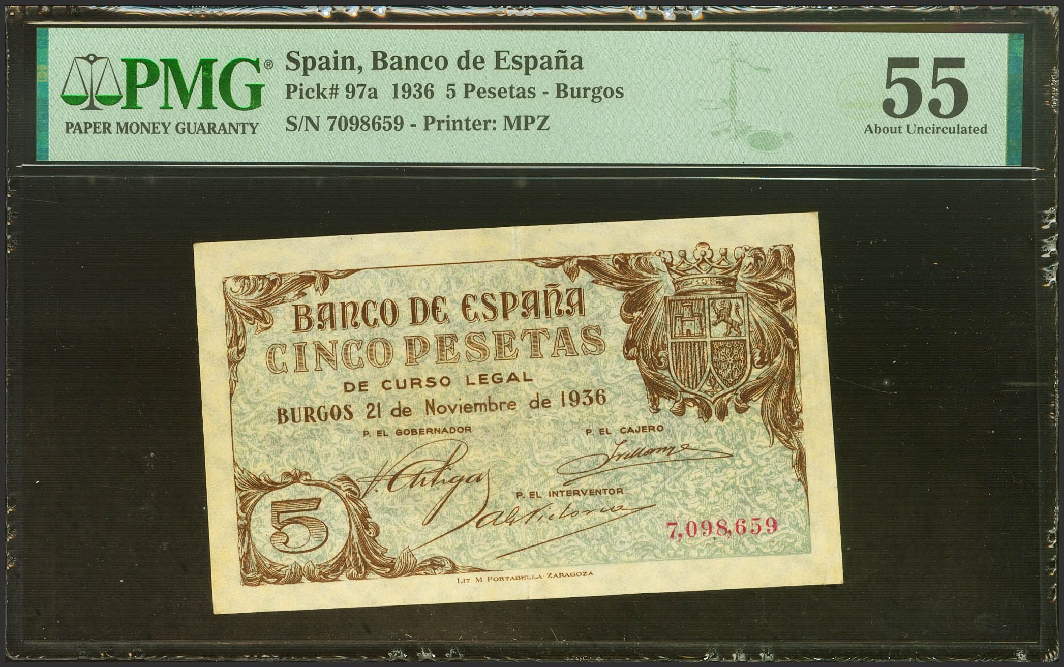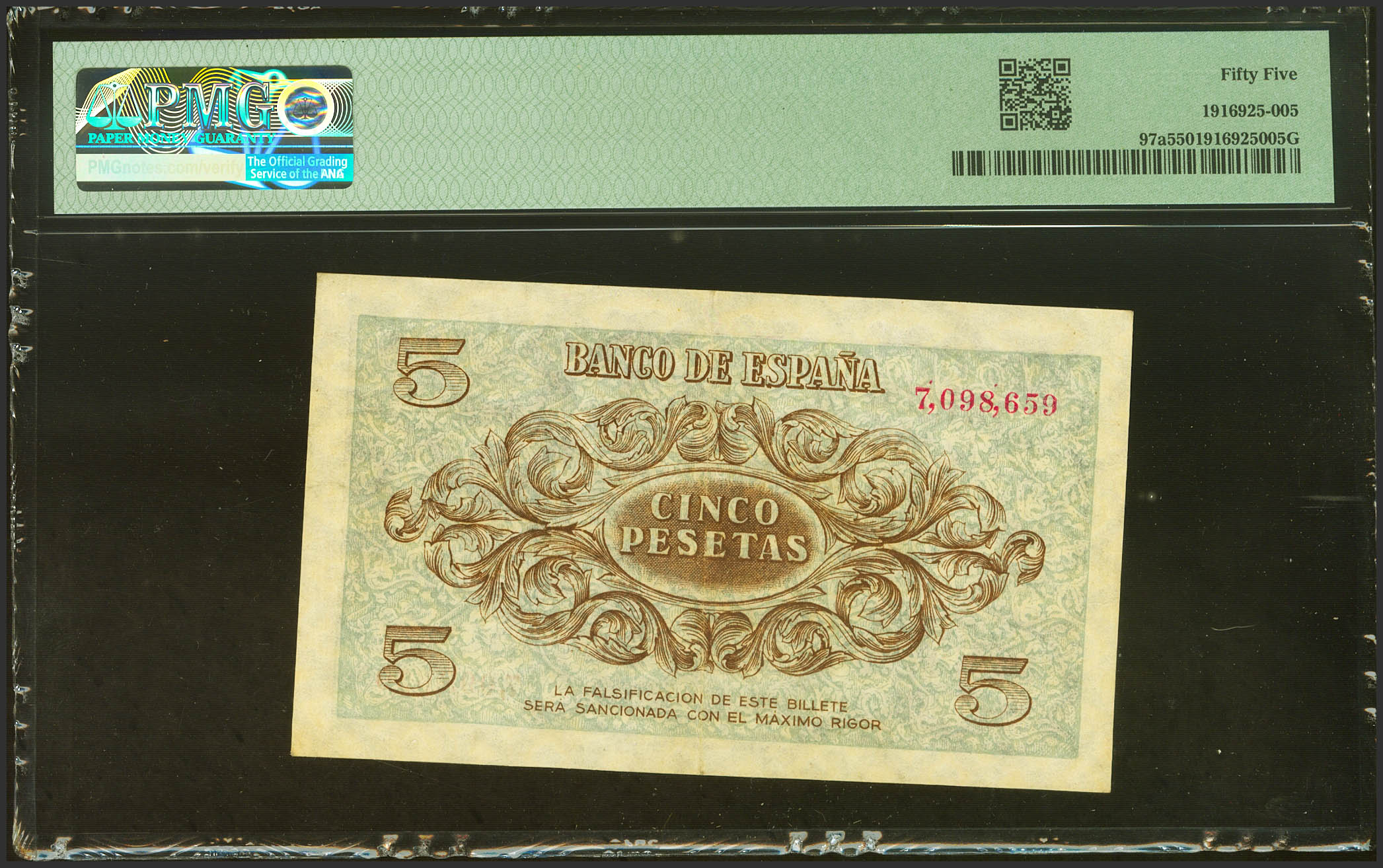 English 5 Pesetas. November 21, 1936. No series. (Edifil 2023: 417, Pick: 97a). Rare, especially in this exceptional condition for this banknote. Extremely Fine. Encapsulated PMG55.