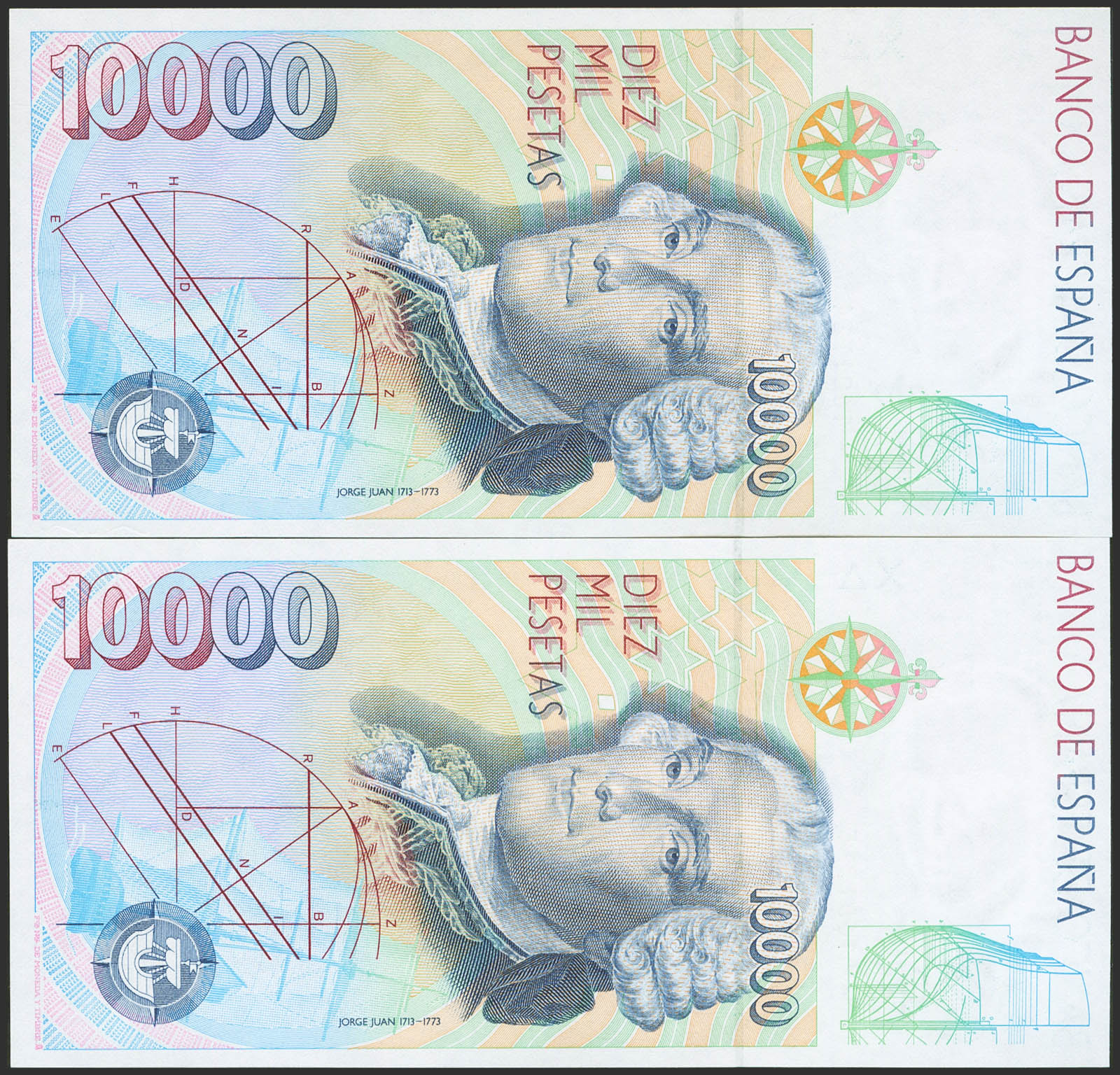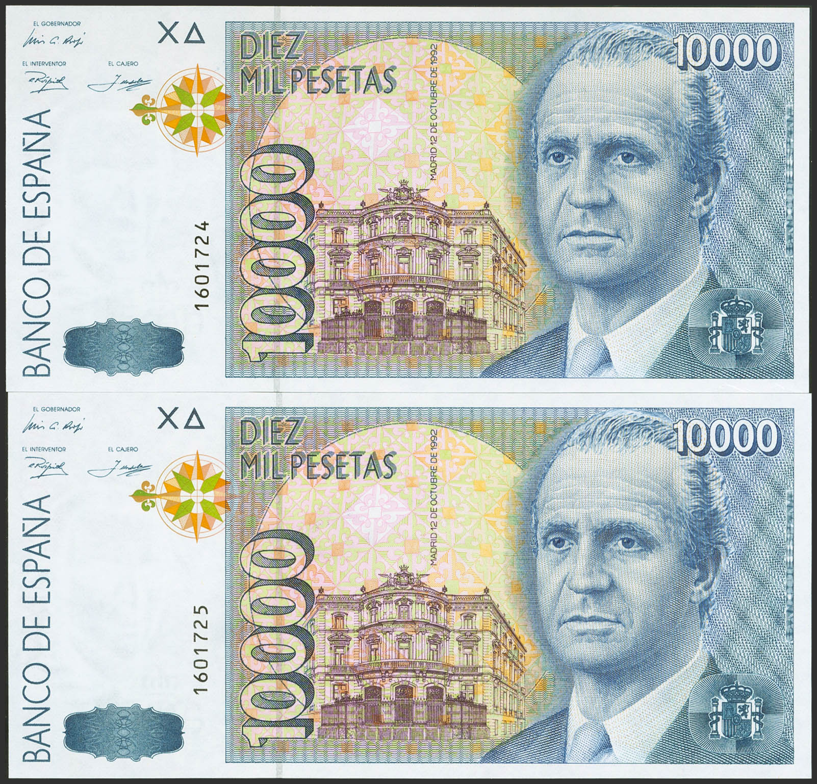 10,000 Pesetas. October 12, 1992. Consecutive pair. No series. (Edifil 2021: 485). Uncirculated.