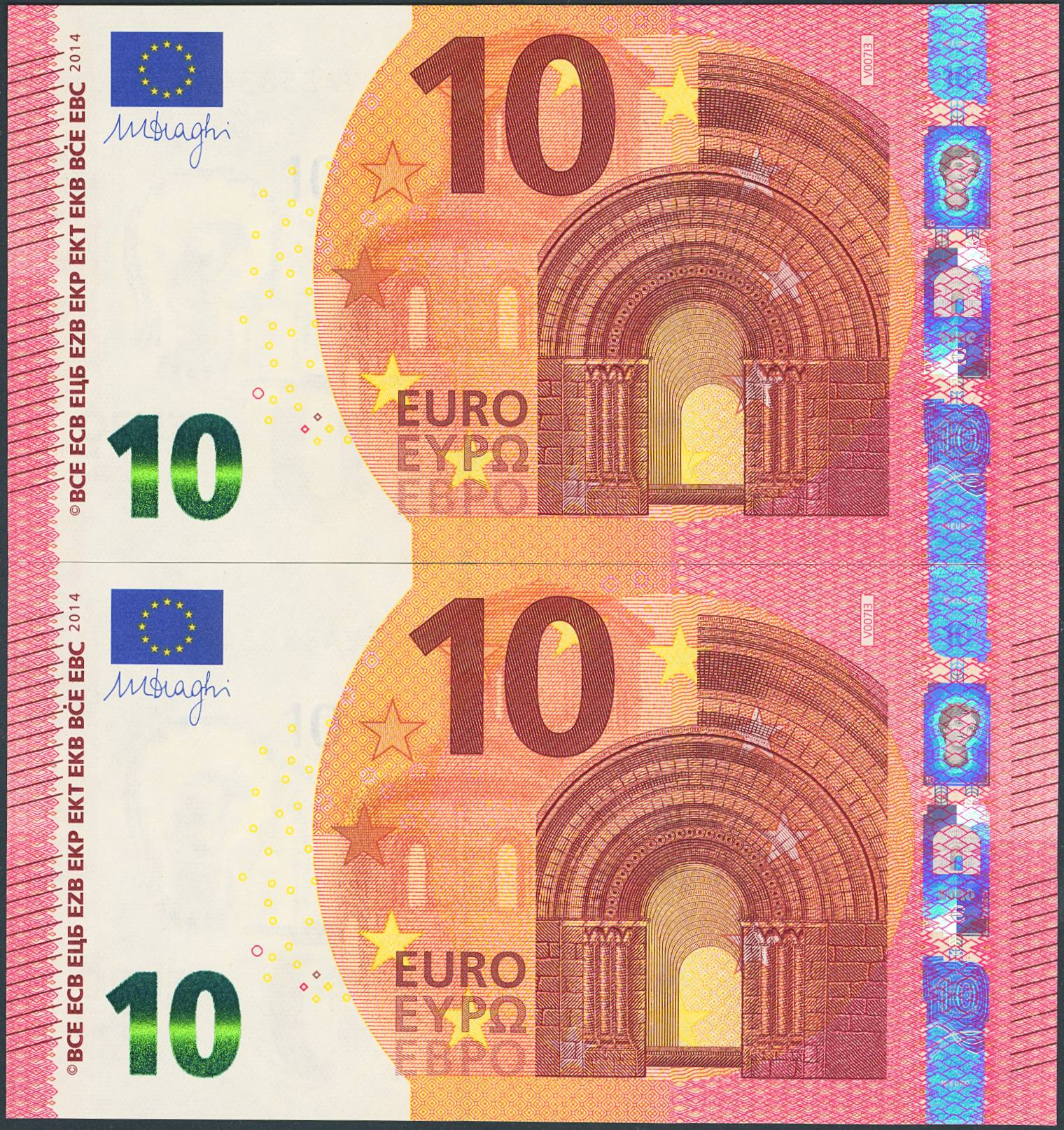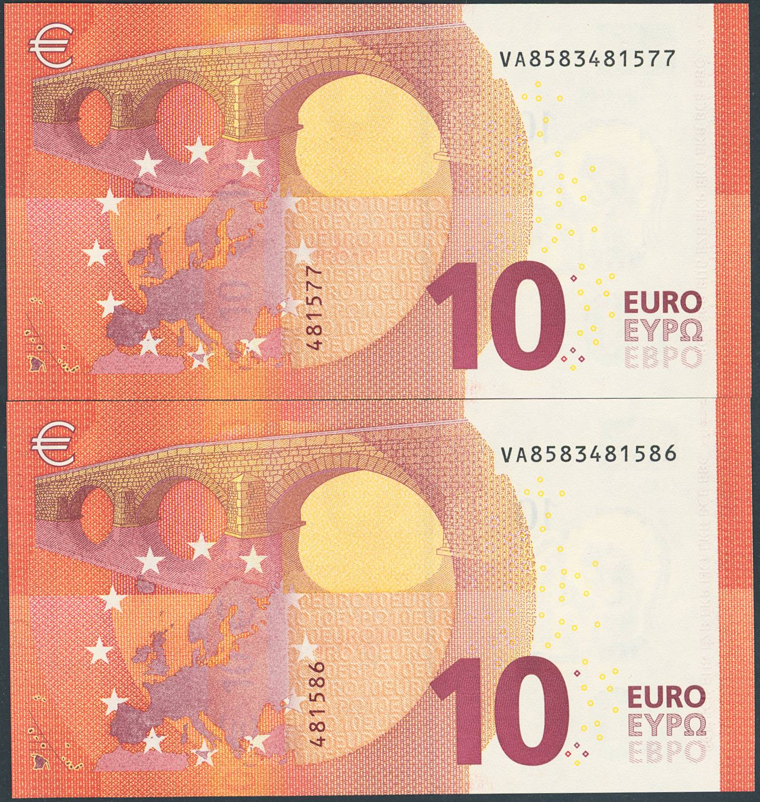 10 Euros. September 23, 2014. Consecutive pair (it should be noted that the last digit in the serial number of all euro banknotes is for the internal control of the European Central Bank; the penultimate digit is the one that determines the serial number of the banknotes). Draghi signature. Series V (Spain). (Edifil 2021: 494, Pick: 21v). Uncirculated.