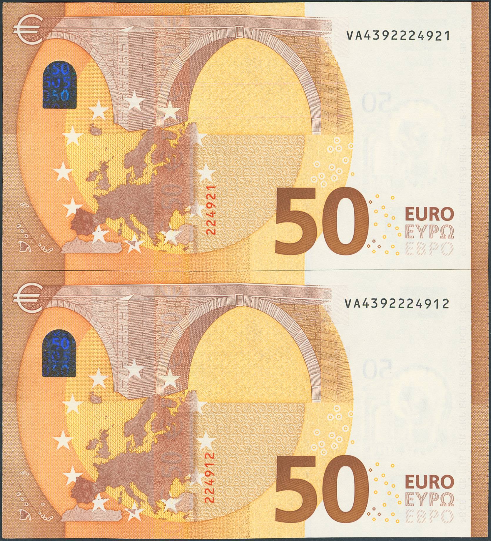 50 Euros. April 4, 2017. Consecutive pair (it should be noted that the last digit of all euro banknotes is for internal control by the European Central Bank; the penultimate digit is used to determine the serial number). Draghi signature. Series V (Spain). (Edifil 2021: 496). Uncirculated.