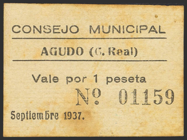 English AGUDO (CIUDAD REAL). 1 Peseta. September 1937. (González: 86). Very rare. EF-.