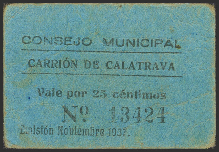 CARRION DE CALATRAVA (CIUDAD REAL). 25 Centimos. November 1937. (González: 1679). Rare. VF.