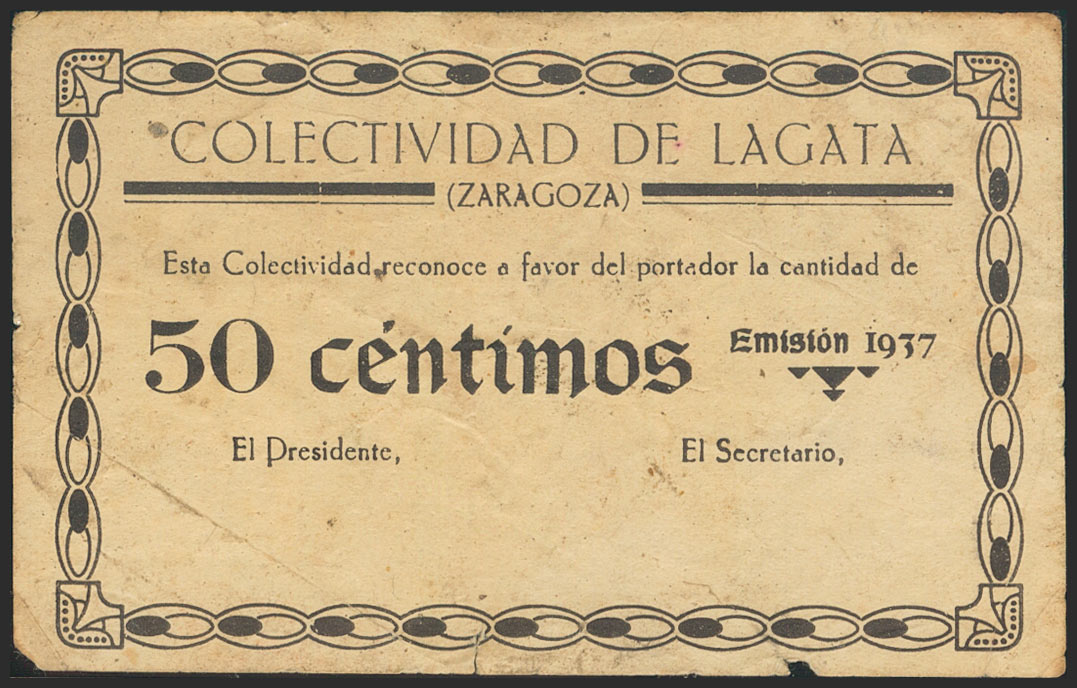 LAGATA (ZARAGOZA). 50 Centimos. (1937ca). (González: 3089). Unusual. VF-.