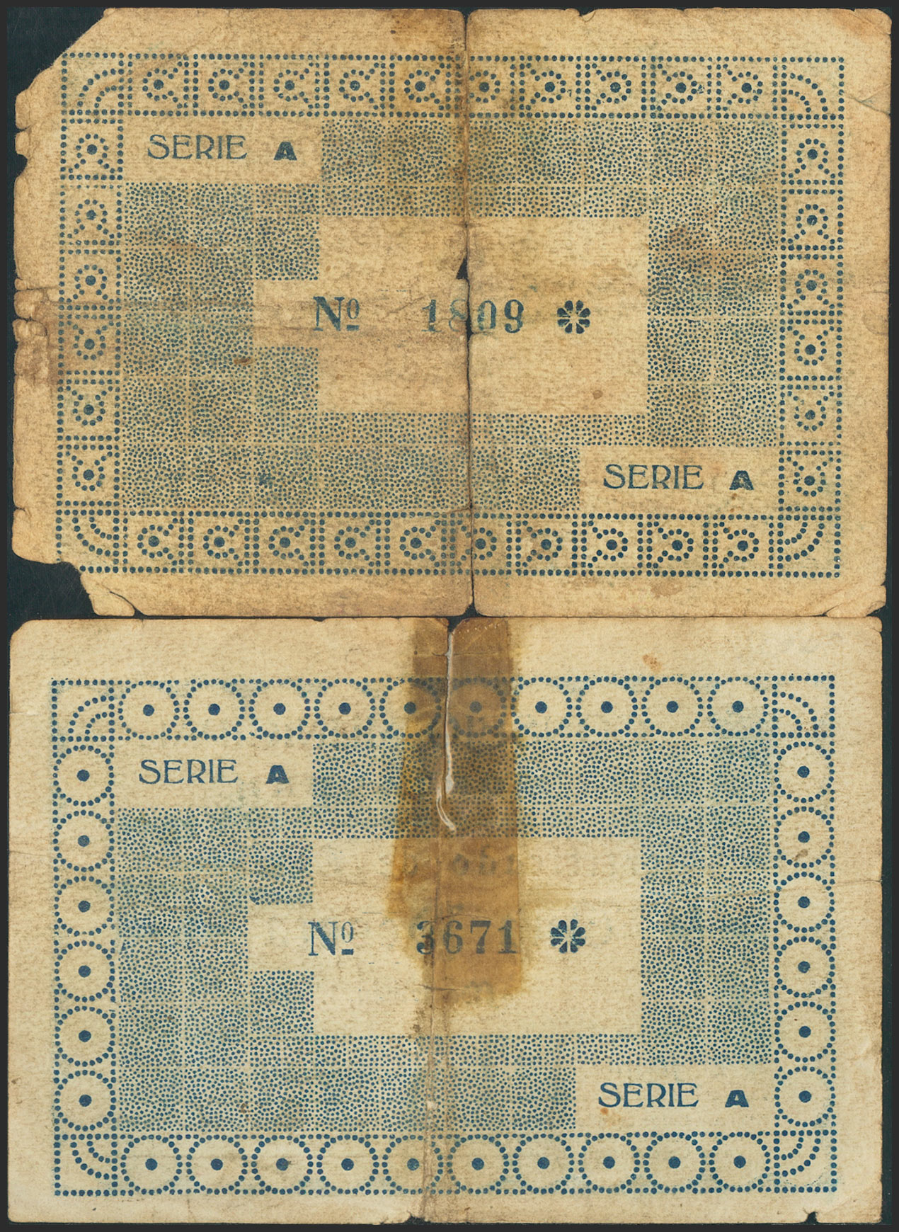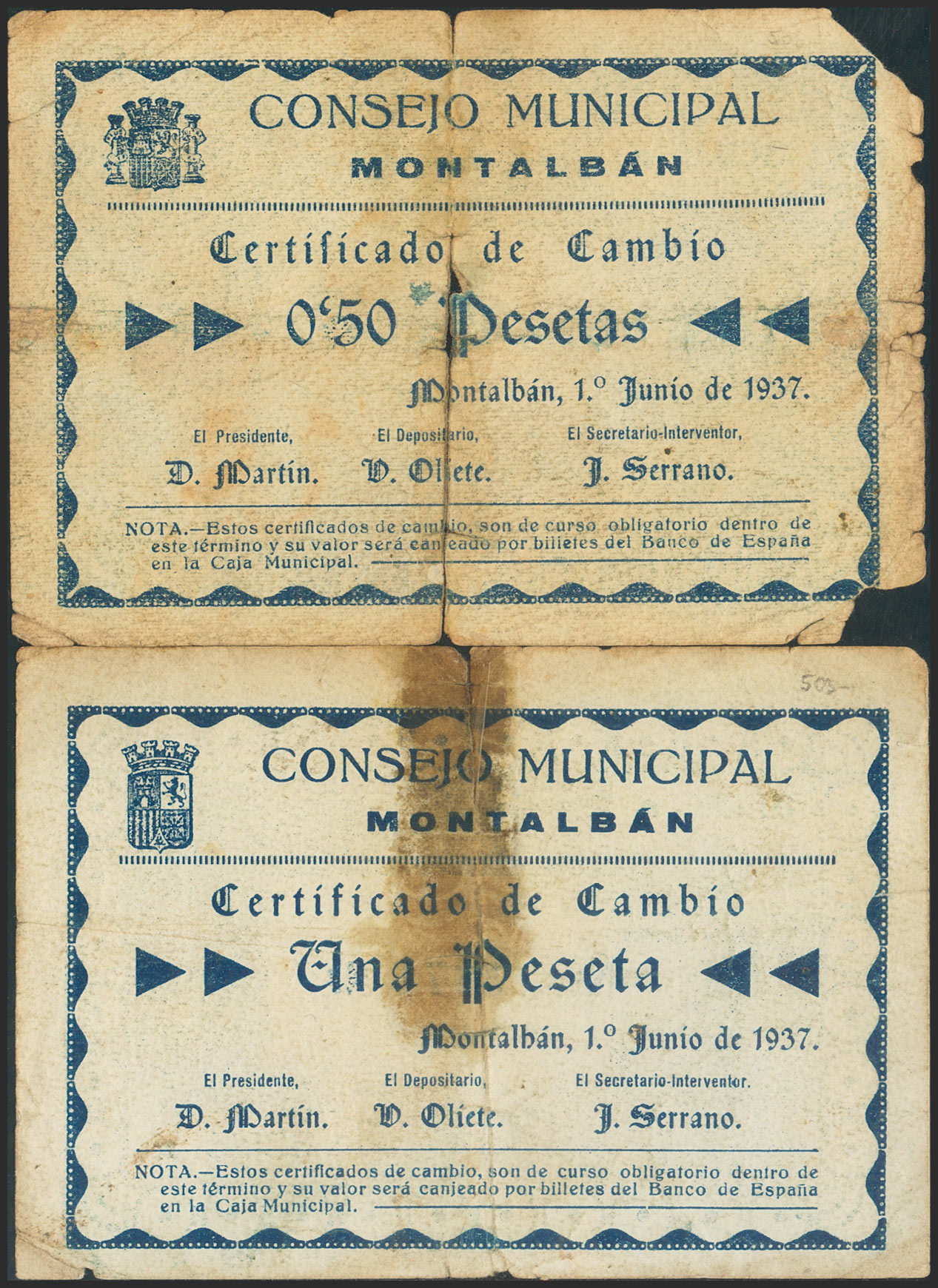 MONTALBAN (TERUEL). 50 Centimos and 1 Peseta. June 1, 1937. Series A, both (González: 3618/19). Very rare, the 1 pt coin has adhesive tape on it. Good.