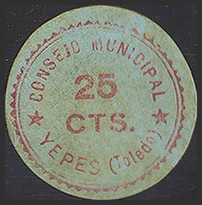 YEPES (TOLEDO). 25 Centimos. (circa 1937). (González: not mentioned). Extremely rare. To give an idea of the rarity of this banknote, the González catalog only mentions the 10-cent and 15-cent denominations; this denomination is very likely unpublished to date. EF-.