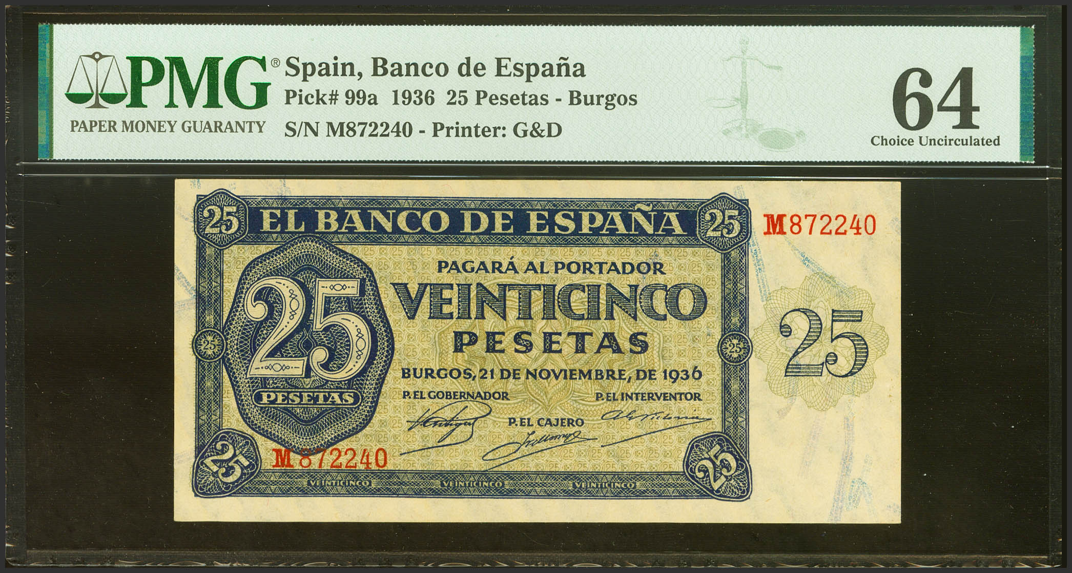 25 Pesetas. November 21, 1936. Series M. (Edifil 2023: 419a, Pick: 99a). Unusual in this condition. Uncirculated. PMG64 encapsulated.