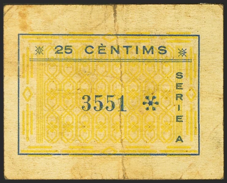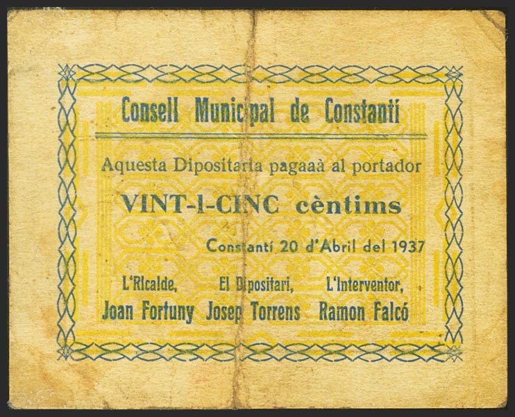 English CONSTANTI (TARRAGONA). 25 Centimos. April 20, 1937. Series A. (González: 7651). Rare. VF-.