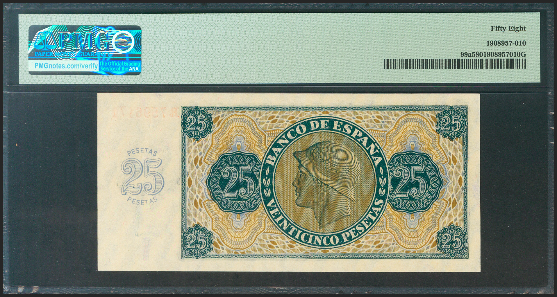 English 25 Pesetas. November 21, 1936. Series R. (Edifil 2021: 419a, Pick: 99a). Good Extremely Fine+. PMG58 package.
