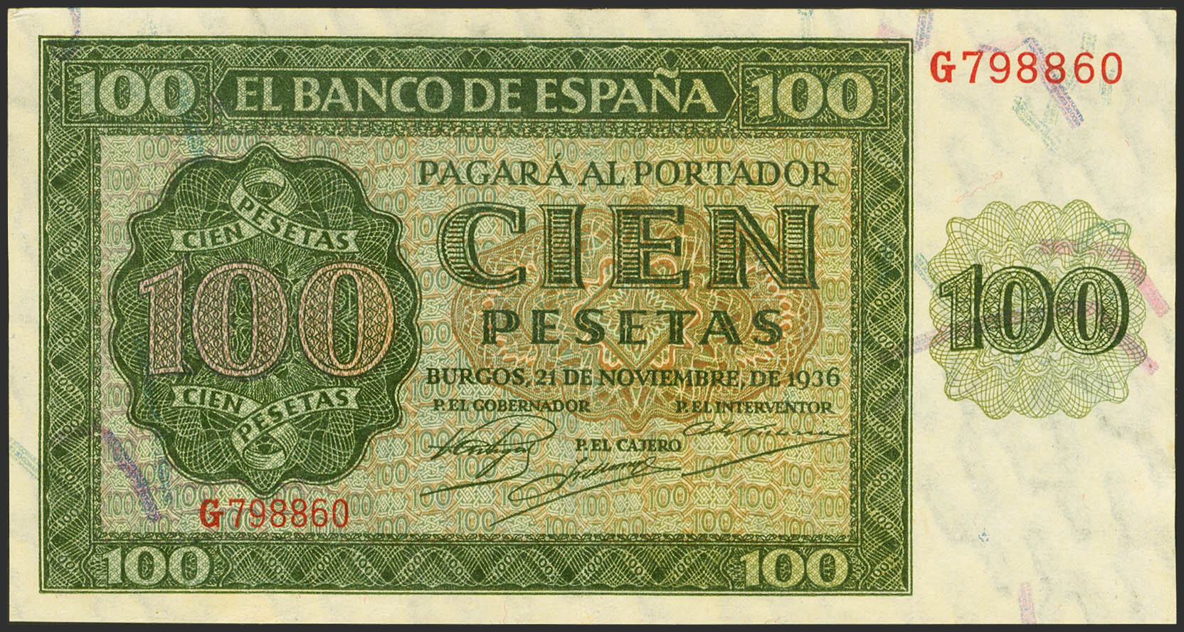 100 Pesetas. November 21, 1936. Series G. (Edifil 2021: 421a). Retains much of its original finish. EF++.